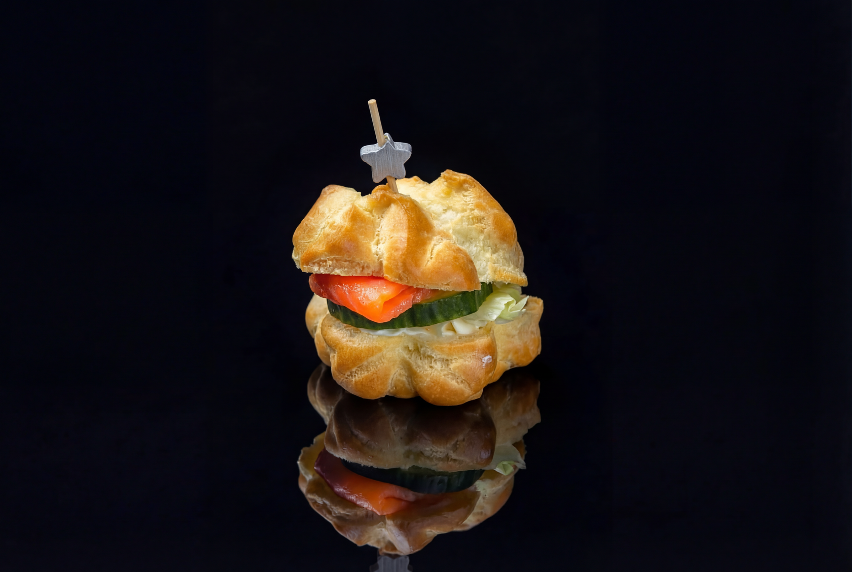 Мини бургер-профитроли с говяжьей котлетой порадуют вас насыщенным вкусом и сочностью, дополненные свежими овощами и пикантным соусом сальса. Для тех, кто предпочитает курицу, мы предлагаем вариант с куриной котлетой и соусом «Цезарь», который добавляет особую нотку. Любители рыбы оценят мини бургер-профитроли с лососем — легкий и свежий, он прекрасно гармонирует с хрустящим салатом айсберг. А для настоящих ценителей мяса мы приготовили профитроли с ростбифом, где нежная говяжья вырезка в сочетании с сыром чеддер и соусом барбекю создают неповторимый вкус.