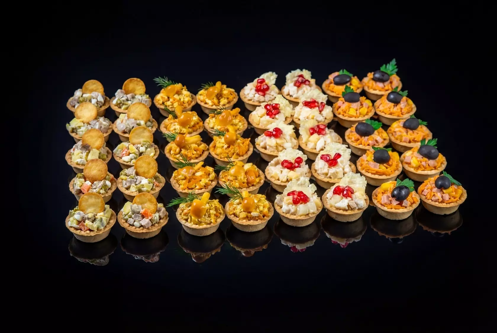 Приятные свежие салатики в тарталетках, хорошо что ассорти, каждый найдет себе что ему по душе. Выделю оливье с уткой и курица с ананасом, понравились.