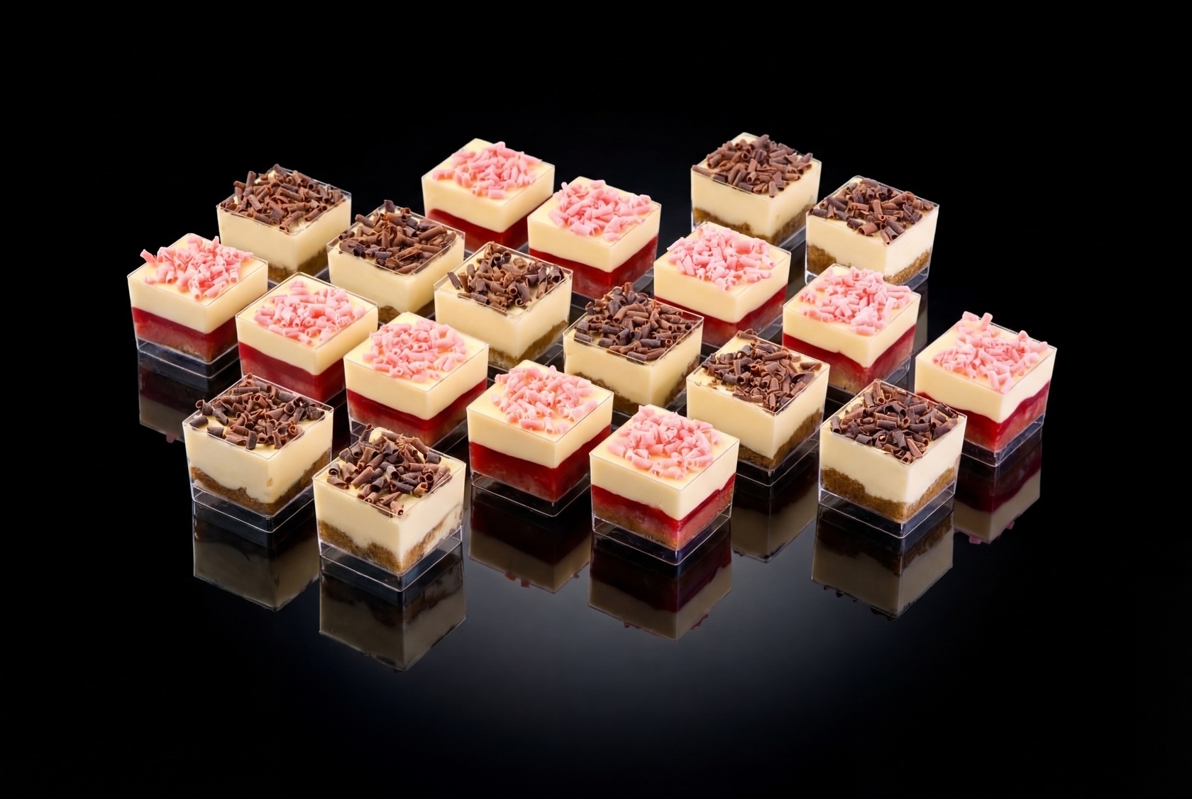 Набор классических и клубничных пирожных Триамису в верринах – удобное и вкусное угощение на любое мероприятие.