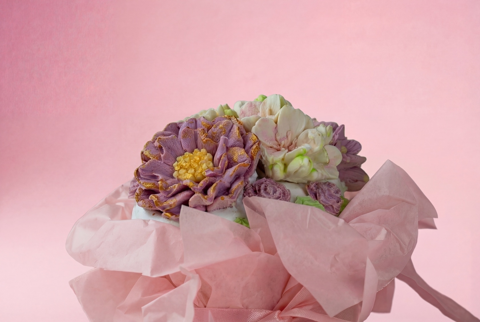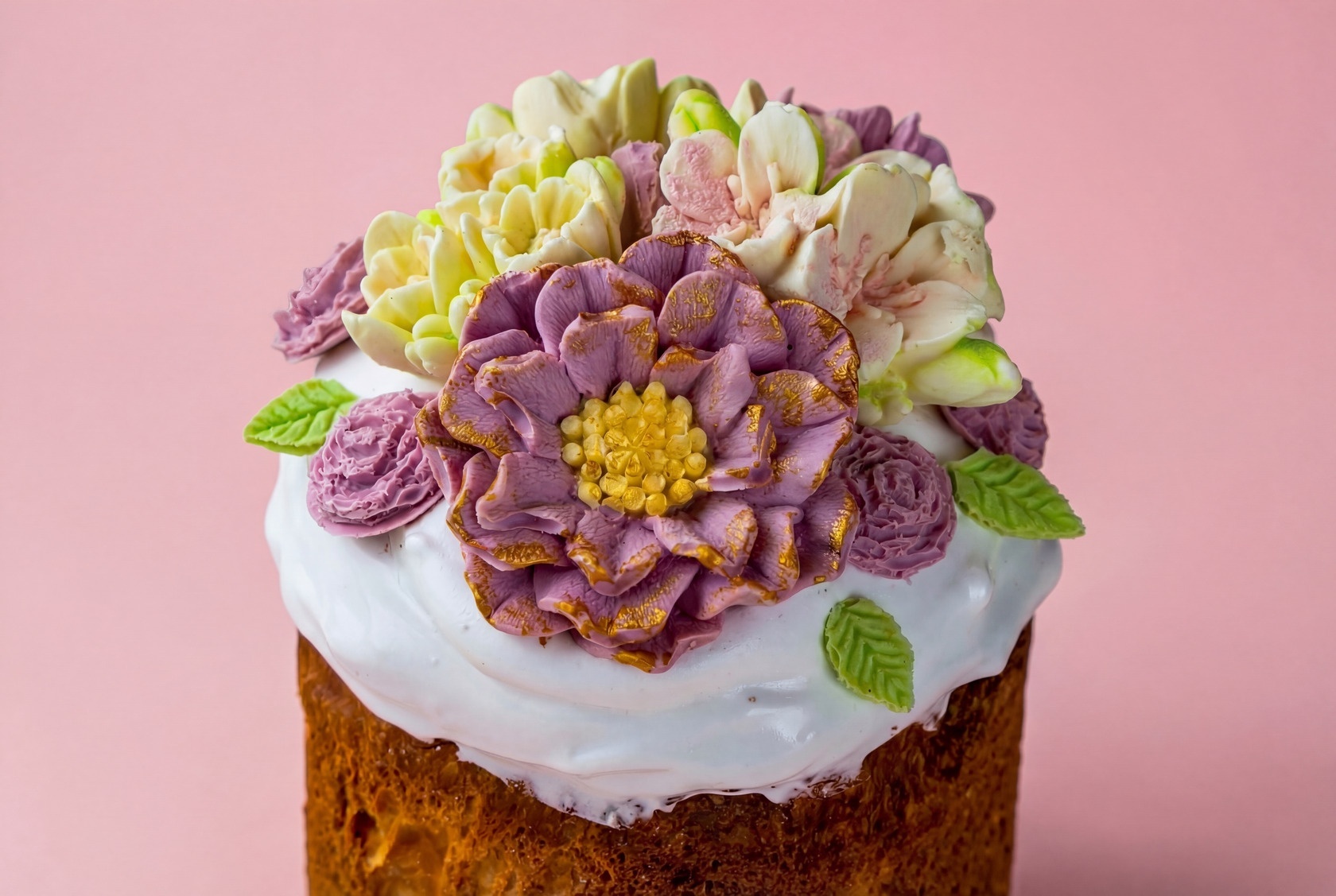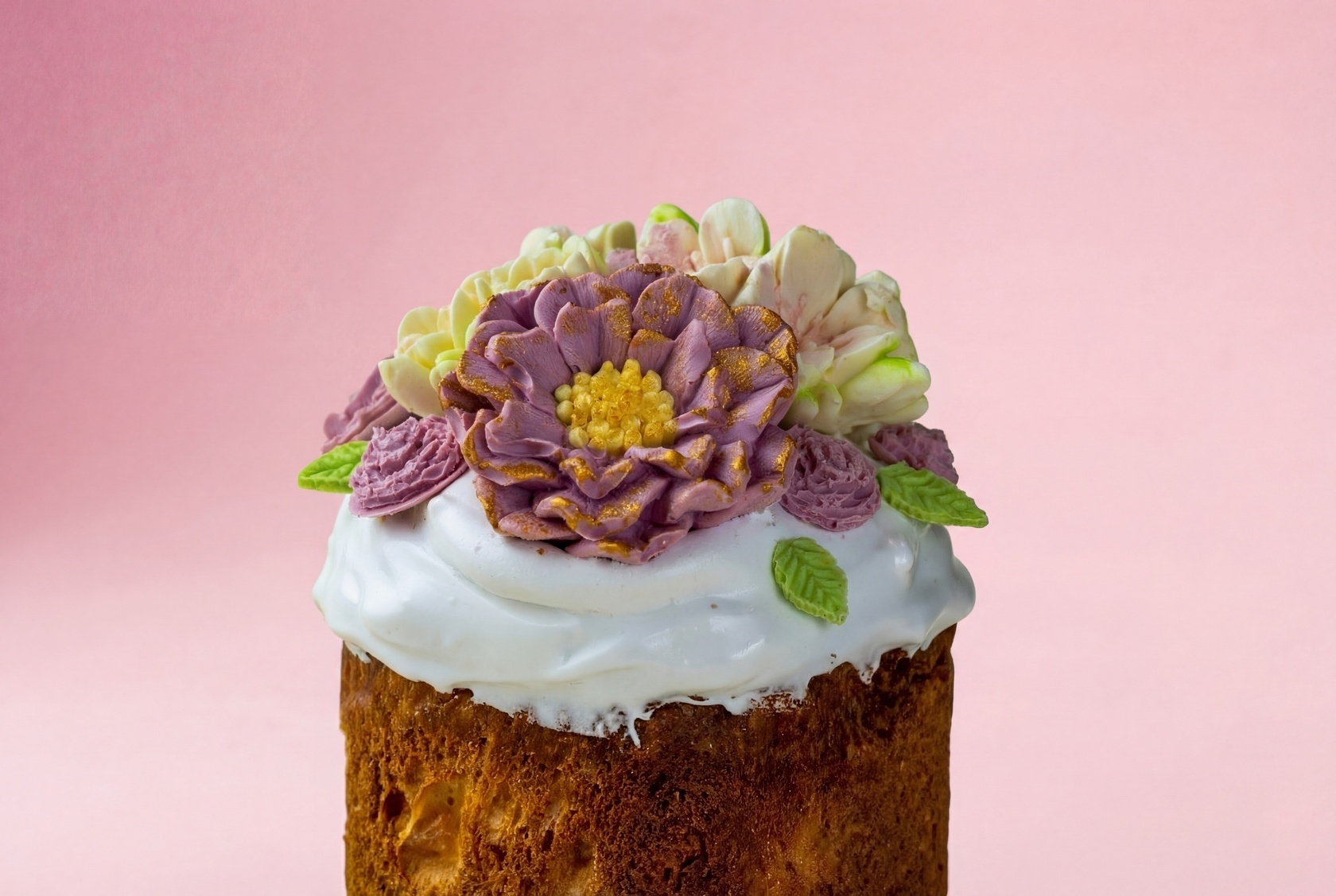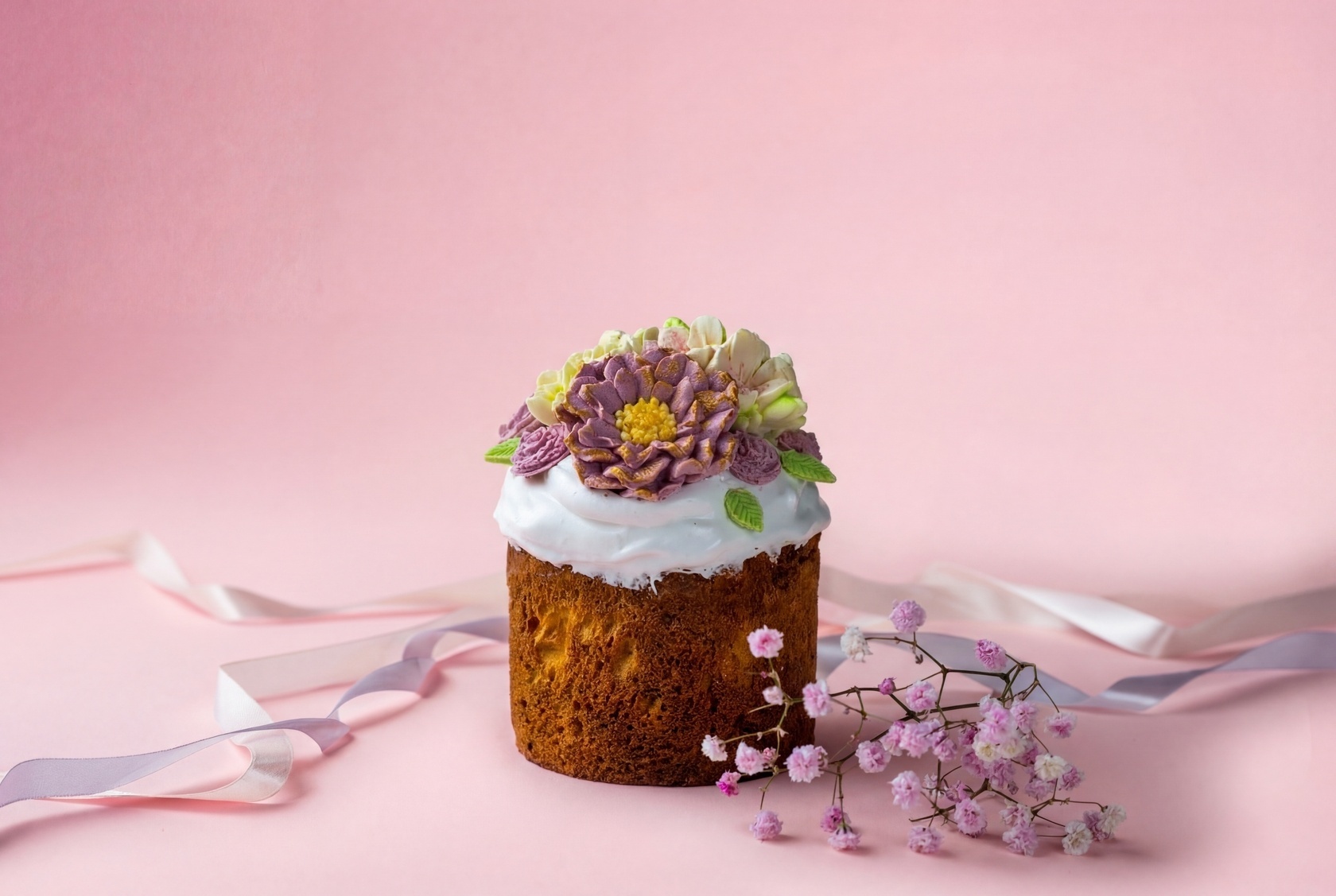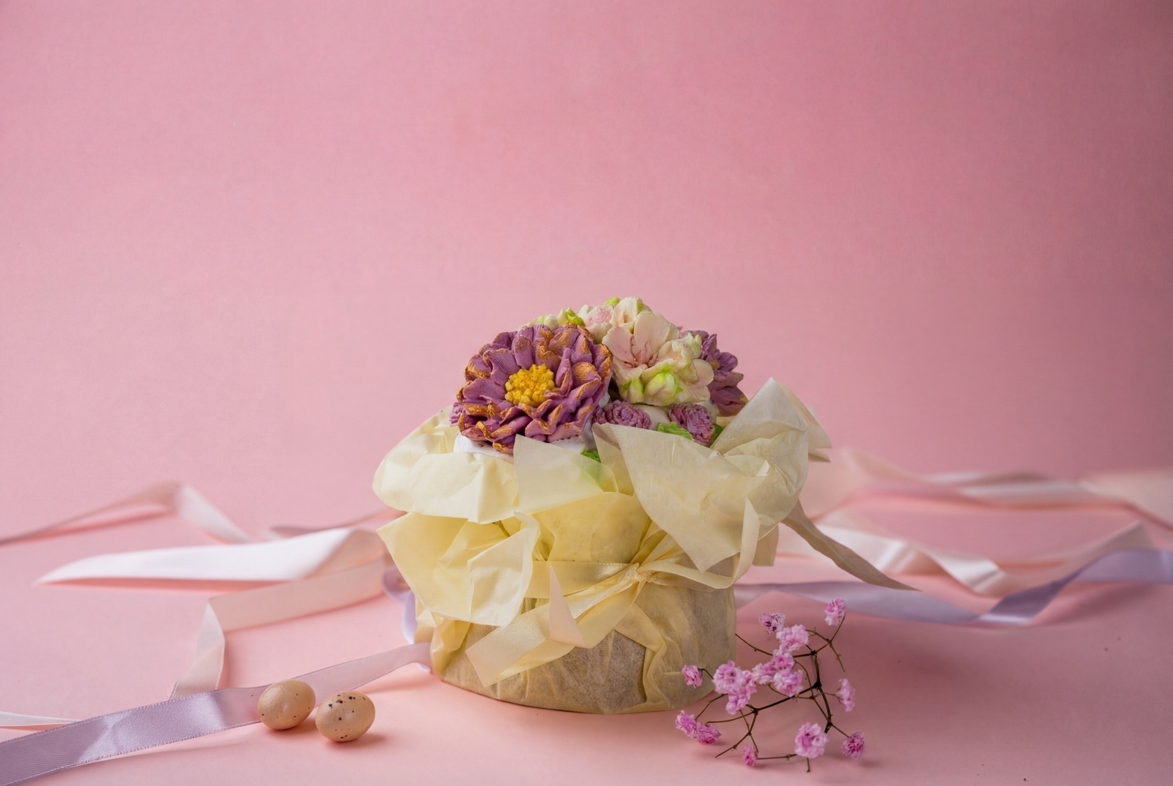 Сверху бриошь – кулича глазурь и яркие цветы из шоколада и шоколадной глазури. Оформлен кулич в яркую, праздничную упаковку.