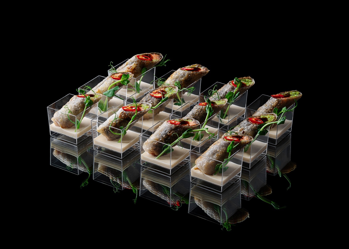Азиатский ролл с лососем и мини-спаржей - утончённая холодная закуска с чистым вкусом рыбы и аккуратным контрастом текстур. Нежное филе сёмги заключено в тончайшую рисовую бумагу и лист нори, что сохраняет прозрачность вкуса и подчёркивает естественную маслянистость рыбы. Мини-спаржа добавляет свежий хруст и лёгкий зелёный акцент, а ореховый соус создаёт мягкое пряное обрамление, формируя гармоничный, многослойный вкус без резкости. Порционная подача в прозрачных мини-верринах подчёркивает чистую геометрию блюда и его современную азиатскую эстетику. Закуска смотрится стильно, аккуратно и легко становится частью премиальных фуршетных сетов, особенно в наборах с рыбой и гастрономическими миниатюрами.