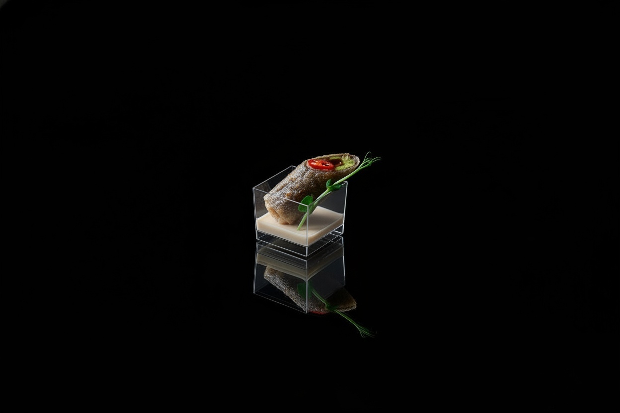Азиатский ролл с лососем и мини-спаржей - утончённая холодная закуска с чистым вкусом рыбы и аккуратным контрастом текстур. Нежное филе сёмги заключено в тончайшую рисовую бумагу и лист нори, что сохраняет прозрачность вкуса и подчёркивает естественную маслянистость рыбы. Мини-спаржа добавляет свежий хруст и лёгкий зелёный акцент, а ореховый соус создаёт мягкое пряное обрамление. Небольшое количество свежего перца чили усиливает вкус лёгкой пикантной нотой, делая общую композицию более яркой и многогранной, но без излишней остроты.Порционная подача в прозрачных мини-верринах подчёркивает чистую геометрию блюда и его современную азиатскую эстетику. Ролл выглядит стильно, аккуратно и естественно вписывается в премиальные фуршетные сеты, особенно в коллекции закусок с рыбой.