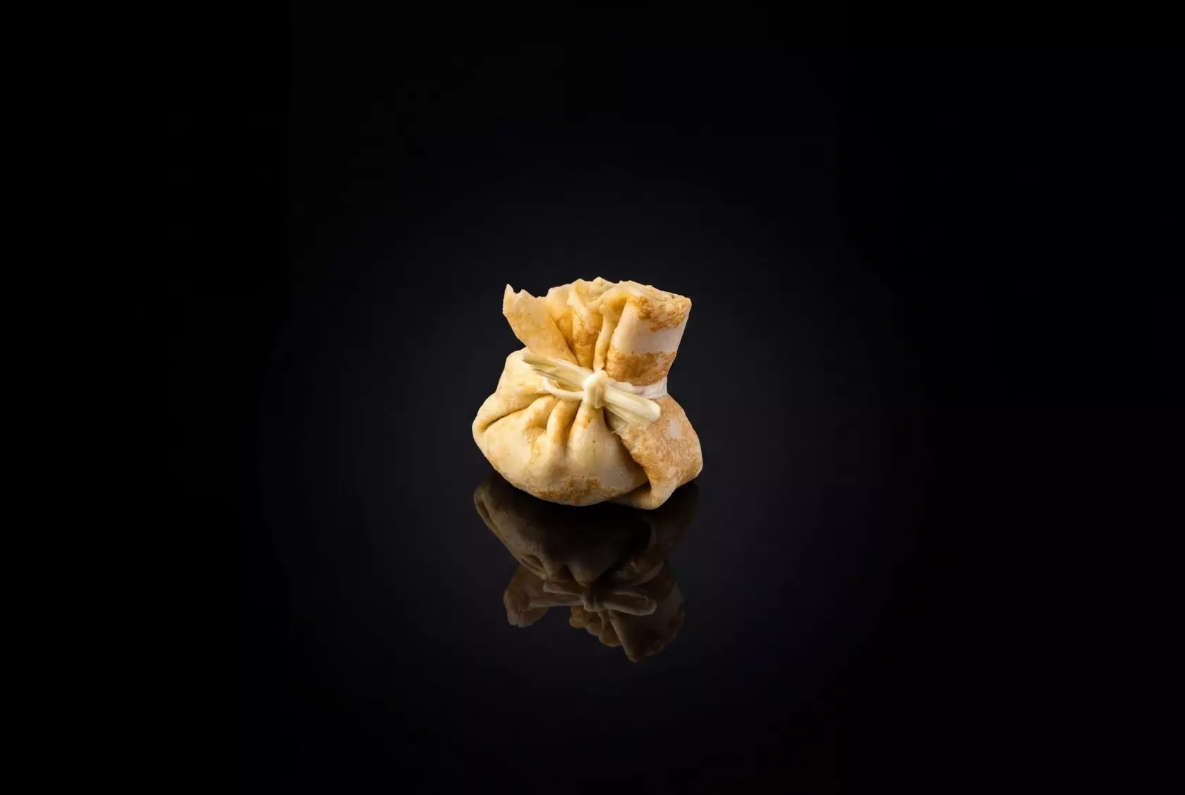 Начинку готовят с репчатым луком и сливками, она получается невероятно сочной, нежной и сытной. Тонкий блинчик с классическим вкусом отлично гармонирует со всеми ингредиентами. У закуски интересный способ подачи, с помощью тонкой ленточки сыра Чечил блинчик с грибами скрепляют в миниатюрный мешочек.