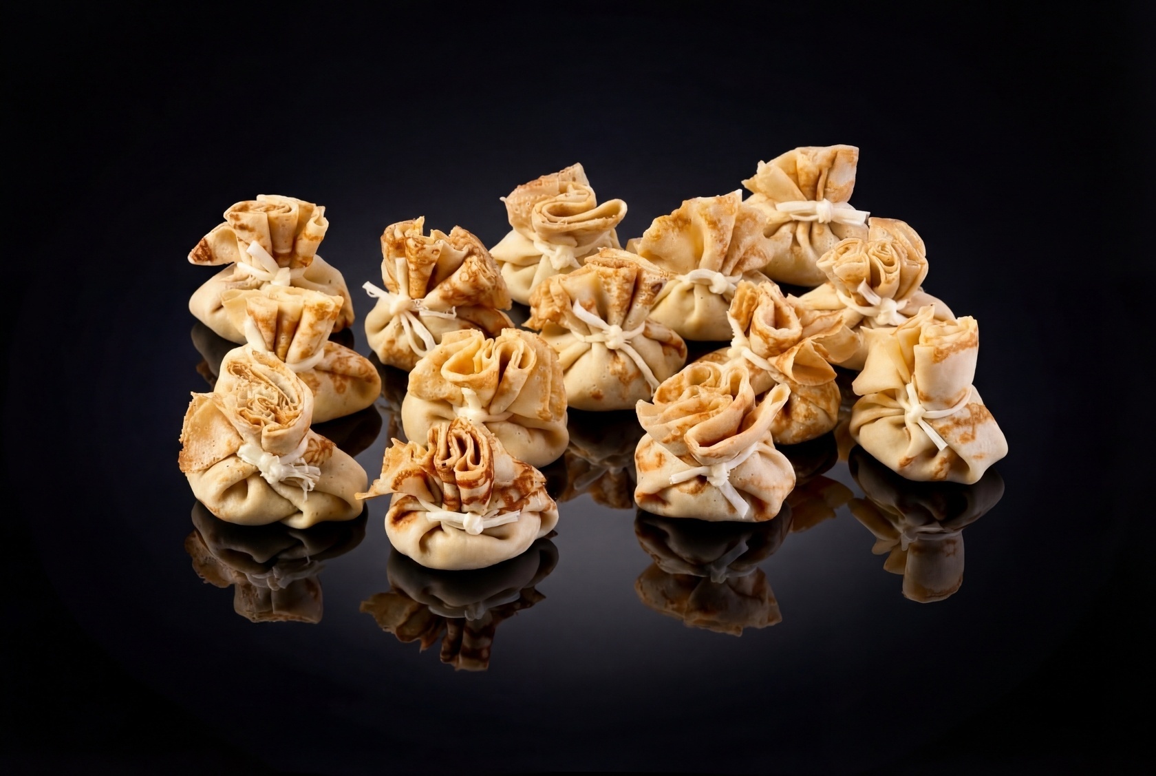 В качестве начинки для блинных мешочков используют грибной жульен из шампиньонов.