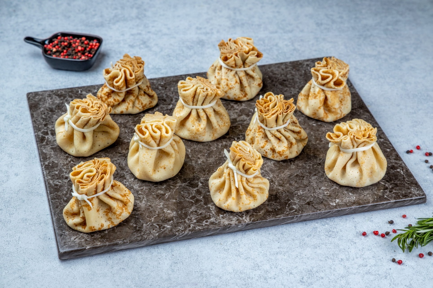 Очень нежные блинные мешочки. Начинки много, она сочная, со сливочным вкусом.