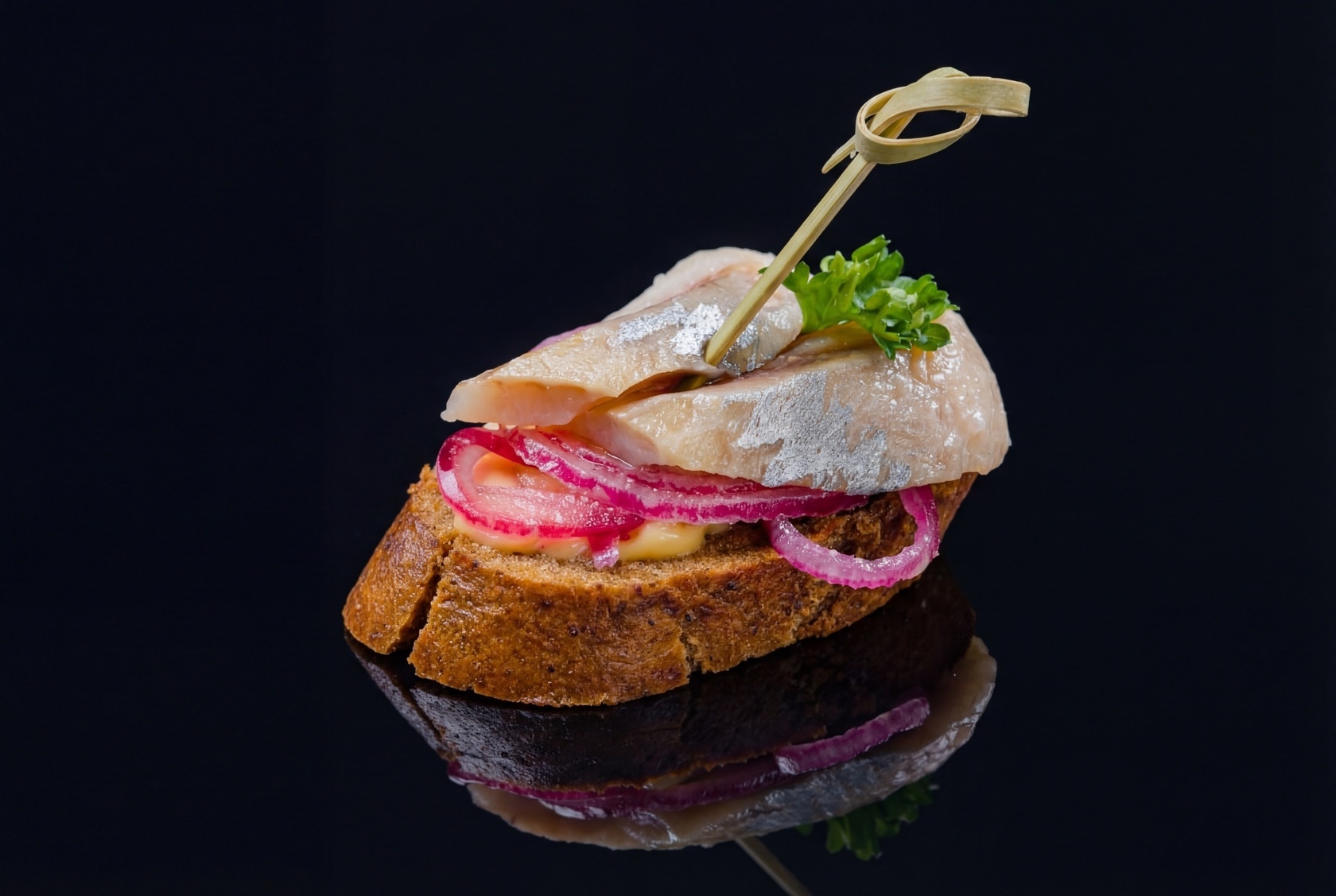 Брускетты на ржаном хлебе с сельдью - классика любого затолья! Хрустящий ржаной багет, служит идеальной основой для нежного филе сельди. Каждый кусочек пропитан медово-горчичным соусом, который добавляет сладковато-острую нотку, прекрасно подчеркивающую вкус рыбы. Дополняет это великолепие тонко нарезанный красный лук, маринованный в винном уксусе.
