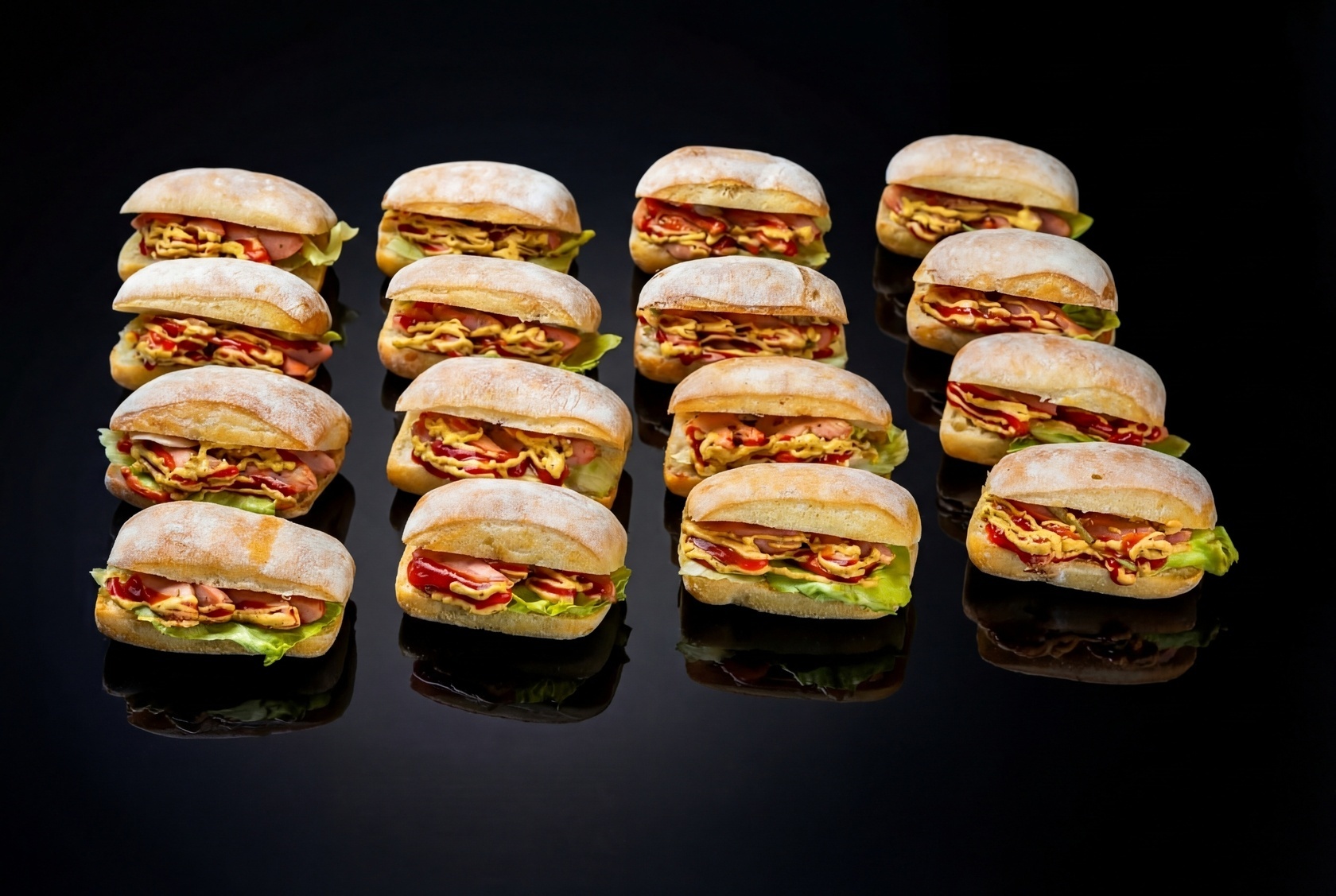 Чиабатта с мини-сосисками — это аппетитная закуска, которая станет настоящим хитом на любом мероприятии. В каждой закуске вы найдете свежую чиабатту, наполненную сочными мини-сосисками, которые идеально дополняются хрустящим салатом айсберг. Эта комбинация создаёт не только насыщенный вкус, но и текстурное разнообразие, которое приятно удивит ваших гостей. Кетчуп и горчица добавляют яркие акценты к этому блюду, делая его ещё более аппетитным и универсальным для любого повода.