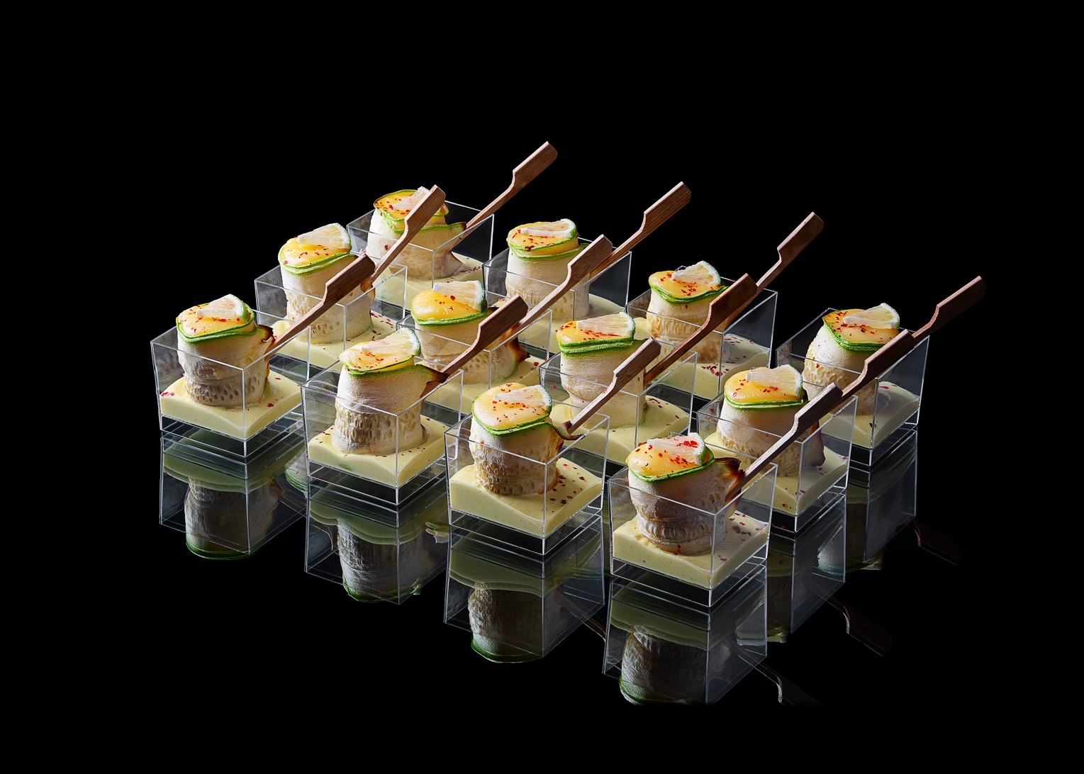 Цукини-ролл с форелью и гаудой - утончённая порционная закуска с чистым, сбалансированным вкусом и современной гастрономической подачей. Нежное филе форели завернуто в тонкие ломтики свежего цукини, создавая естественный контраст мягкой рыбы и лёгкой хрусткости овоща. Гауда придаёт композиции деликатную молочную глубину и мягкий ореховый оттенок, подчёркивая маслянистость форели. Лёгкий аромат белого вина, лука, чеснока и тимьяна формирует тонкое тёплое обрамление, которое раскрывает вкус рыбы, не заглушая его. Подача на тонком сливочном соусе добавляет блюду бархатистость и лёгкую винную кислинку, делая вкус цельным и многослойным. Миниатюрная форма ролла естественно вписывается в прозрачные веррины, подчёркивая аккуратность и чистоту подачи. Эта закуска станет изящным акцентом премиальных фуршетов, банкетов и корпоративных мероприятий, добавляя сервировке ощущение продуманности, стиля и современной гастрономии.