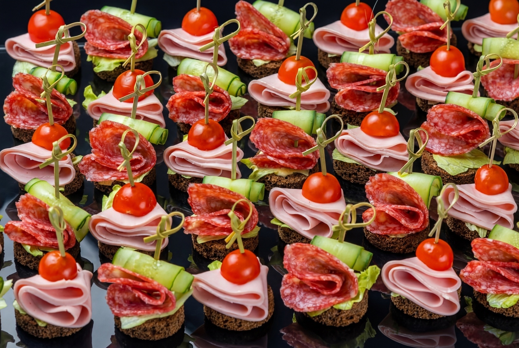 Канапе «Студенческое» состоит из ржаного бородинского хлеба, свежего салата айсберг, нежной докторской колбасы и ярких помидоров черри, заправленных легким майонезом и горчицей. Это сочетание создает гармоничный вкус, который понравится всем вашим гостям. Кроме того, в ассорти присутствует канапе с марочной колбасой. Здесь вы найдете тот же бородинский хлеб, хрустящий свежий огурец и ароматную марочную колбасу, дополненные легкой заправкой.