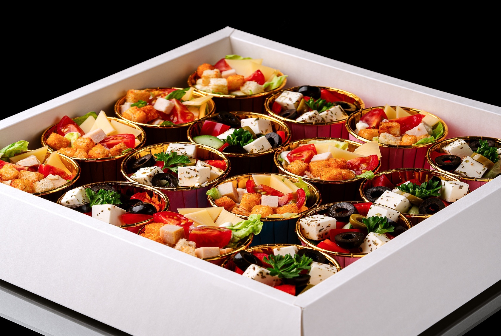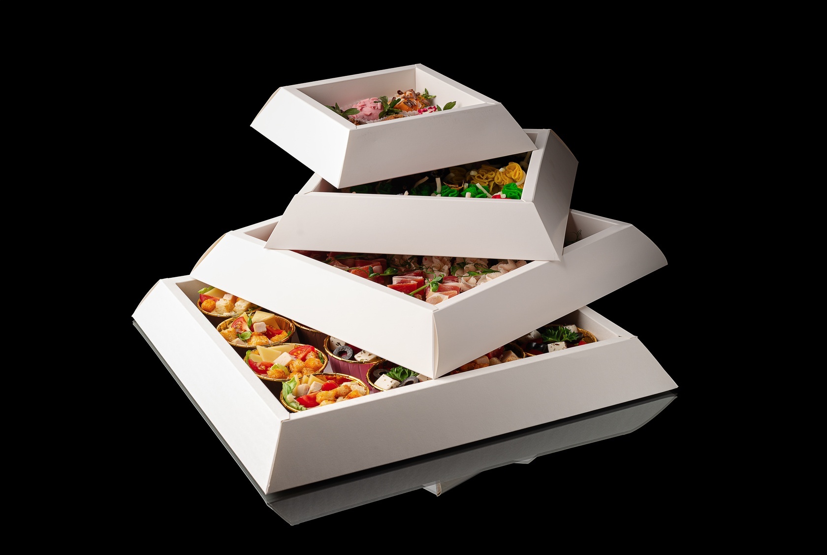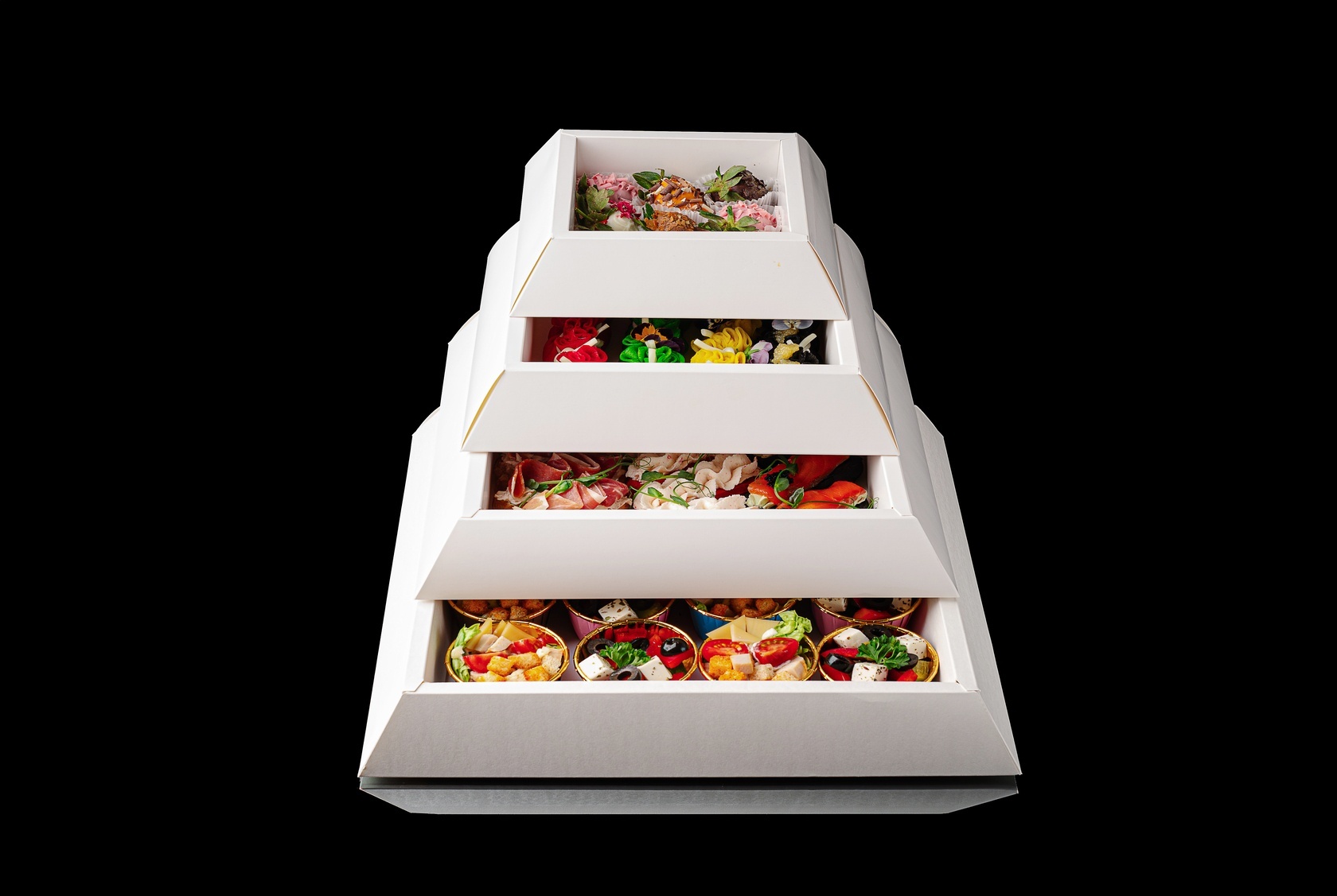 Многоуровневая фуршетная композиция с продуманным сочетанием солёных закусок и десертов. Нижний уровень открывает подачу классическими салатами «Цезарь» и «Греческий» - свежими, понятными и сбалансированными.