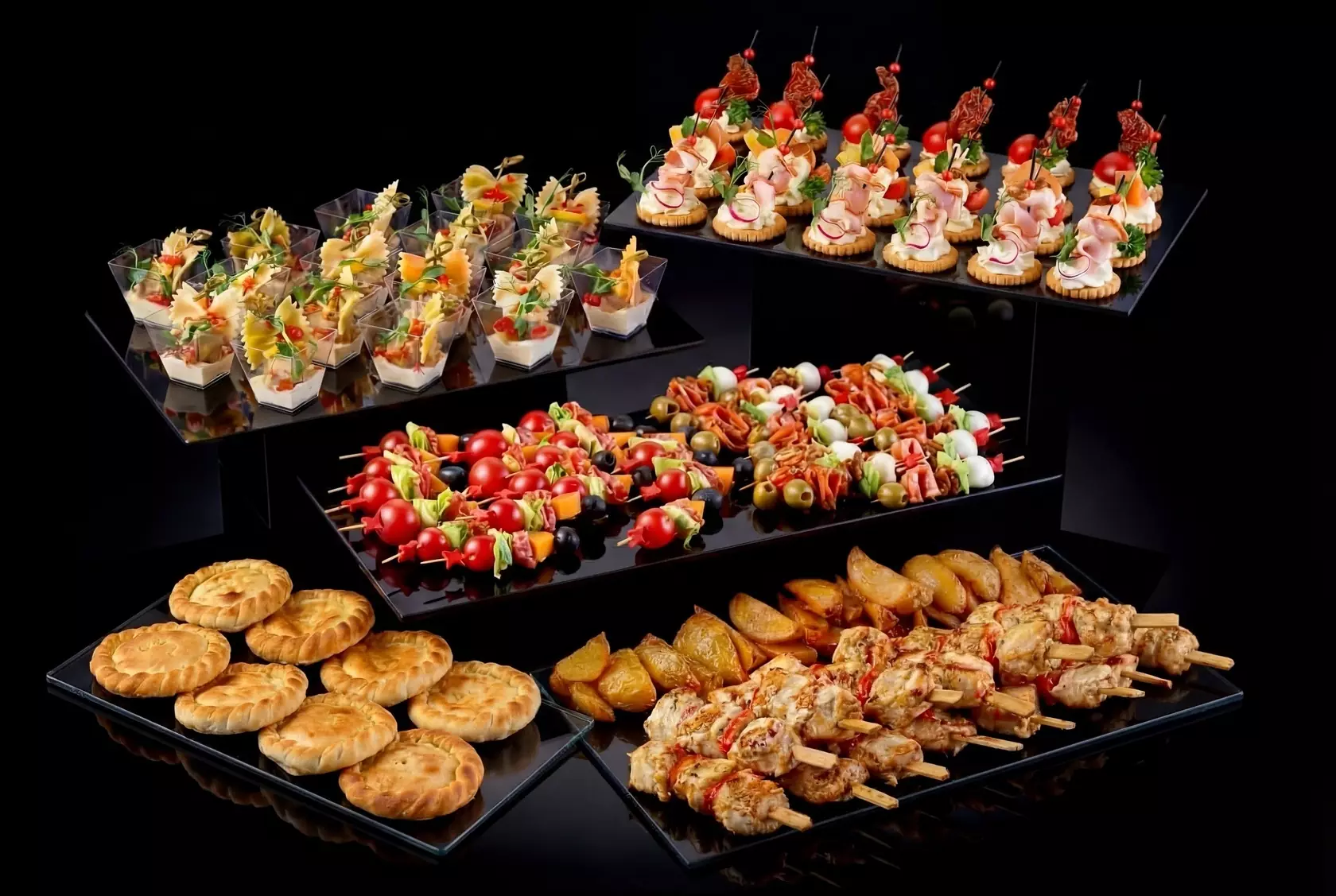 Этот набор закусок рассчитан на большую компанию. В него входят пять сетов с разнообразными закусками. Любителям итальянской кухни понравится антипаста «Альфредо» с шариками сыра моцарелла и оливками. Тем, кто предпочитает более основательные блюда – брошеты из курицы с картофельными дольками и минни осетинские пироги. Любителям рыбы – веррины с рыбными шариками. А ценители итальянской кухни выберут канапе на крекере «Криспи Канапе».