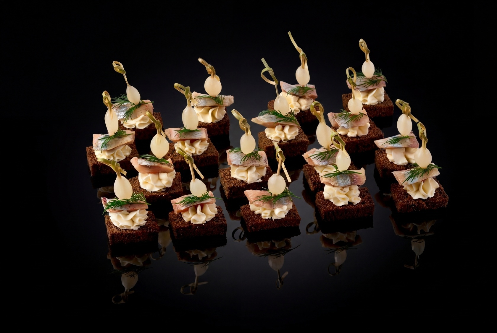 Роскошные Канапе по-норвежски – совершенно новый и очень вкусный формат рыбной закуски. Традиционные угощения со слабосоленой сельдью сложно подать изящно и утонченно, но этот вариант канапе – приятное исключение. Они украсят стол даже на самом пышном, торжественном и ответственном банкете, например, по случаю свадьбы или юбилея. Сет подойдет для фуршета и корпоративного мероприятия.