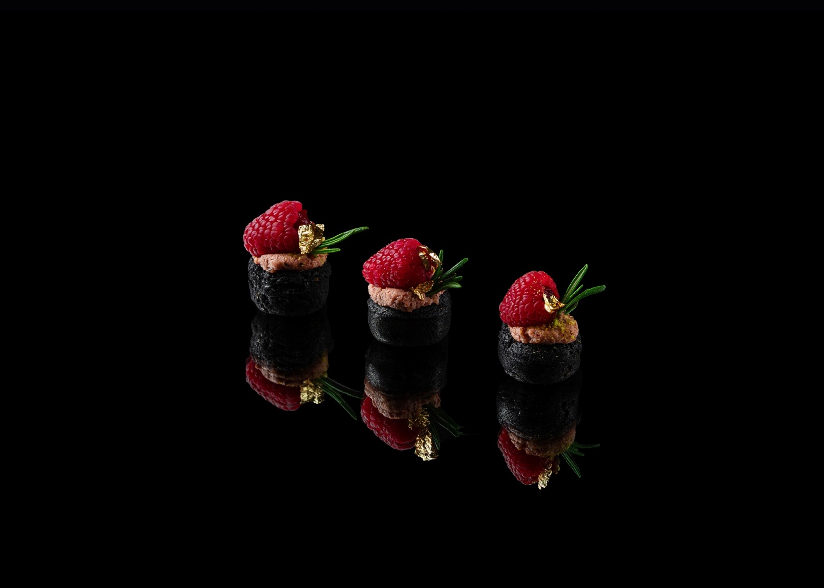 Канапе с гусиным паштетом, ягодным конфитюром и свежей малиной - утончённая закуска с выразительным вкусом и элегантной подачей. Чёрный бисквит на чернилах каракатицы обладает мягкой пористой текстурой и лёгкой солоноватой глубиной, создавая благородную основу для богатых вкусовых акцентов. Нежный паштет из гусиной печени раскрывается сливочной насыщенностью и деликатным, сбалансированным вкусом, который подчёркивается конфитюром из клюквы: лёгкая кислинка, мягкая сладость и насыщенный ягодный аромат формируют гармоничный контраст. Свежая малина добавляет яркий натуральный акцент и сочность, а небольшая веточка розмарина завершает композицию тонкой ароматной нотой, подчеркивая премиальность подачи. Такое канапе легко становится акцентом премиального фуршетного стола - эстетичным, многослойным по вкусу и по-настоящему гастрономичным.
