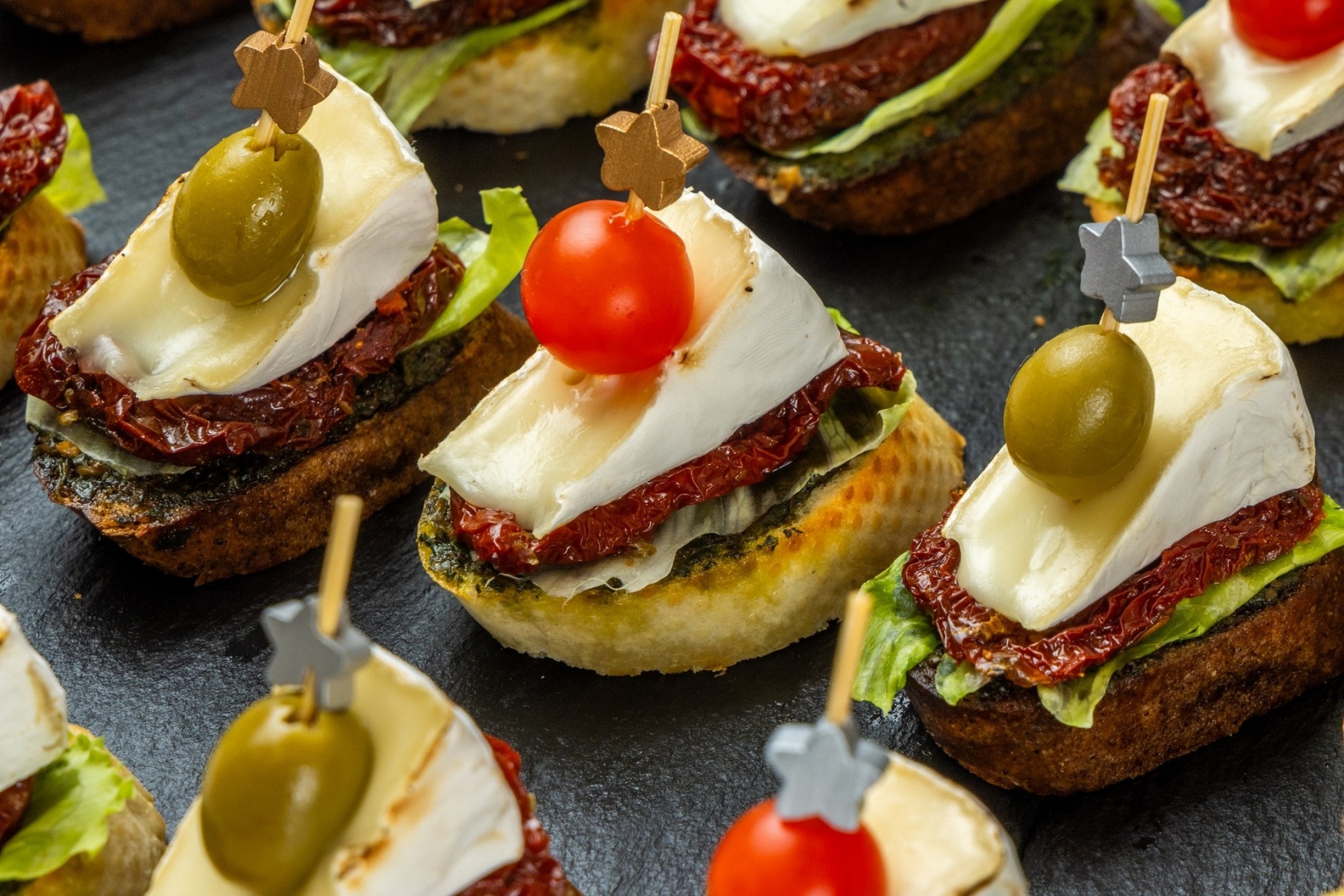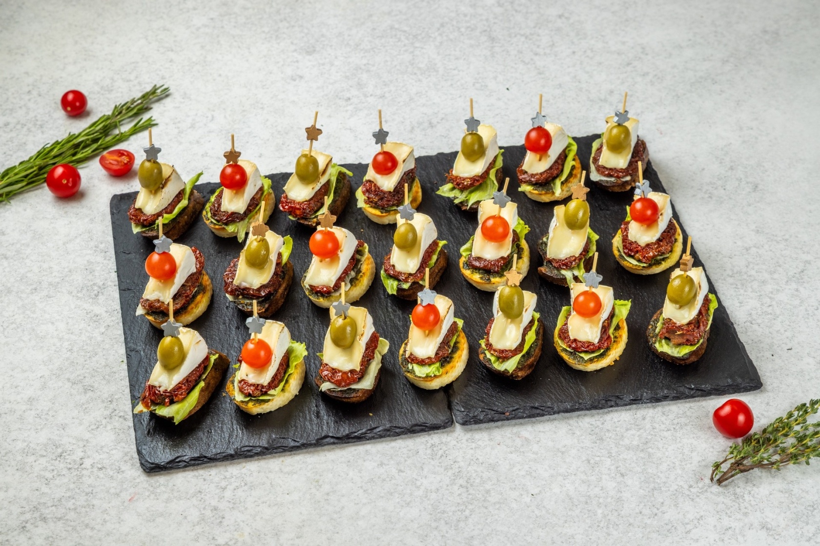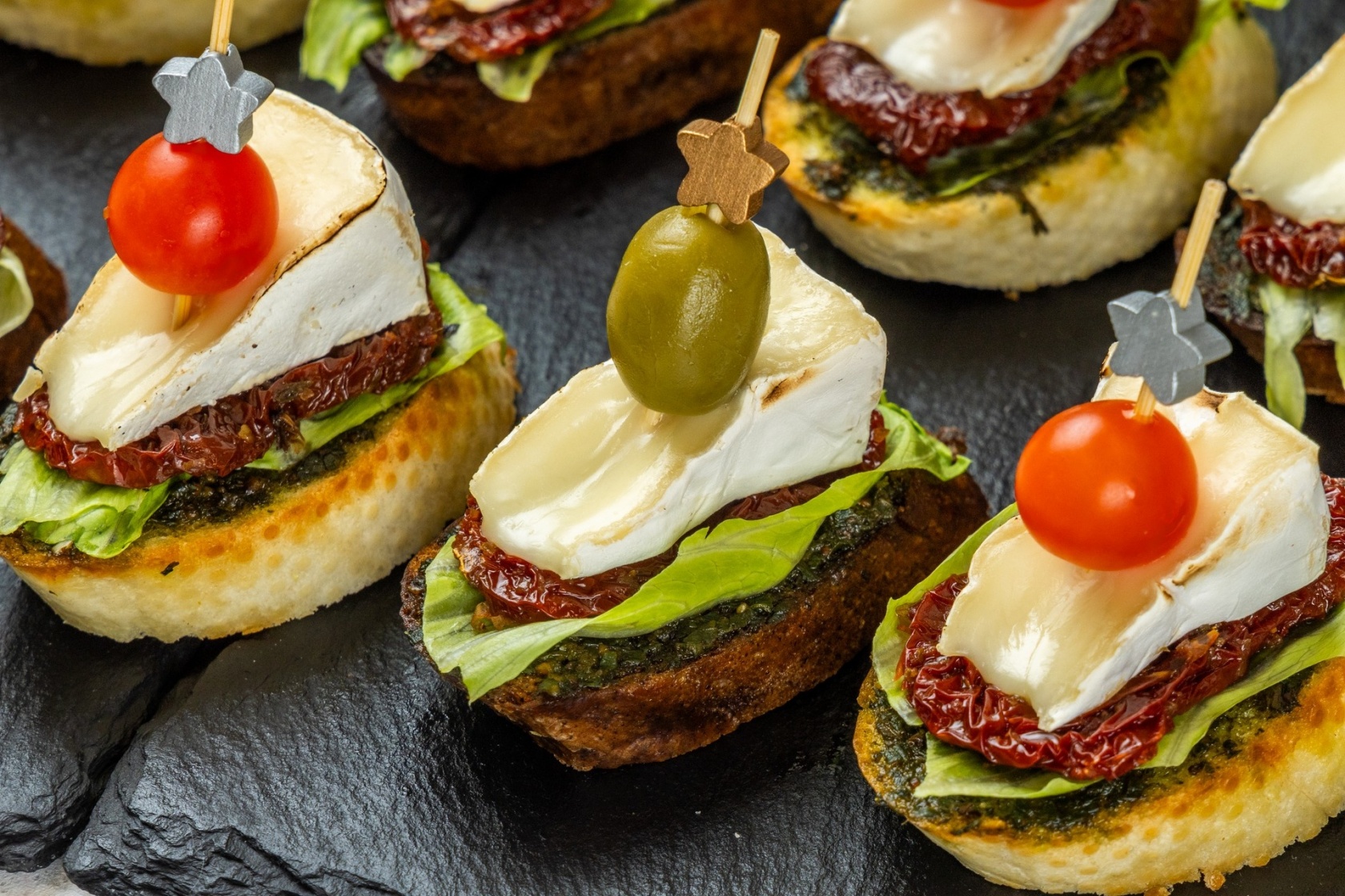 Багет пшеничный, багет ржаной, соус песто, сыр Камамбер, вяленые томаты в масле, салат Айсберг, помидоры Черри, оливки без косточки.
