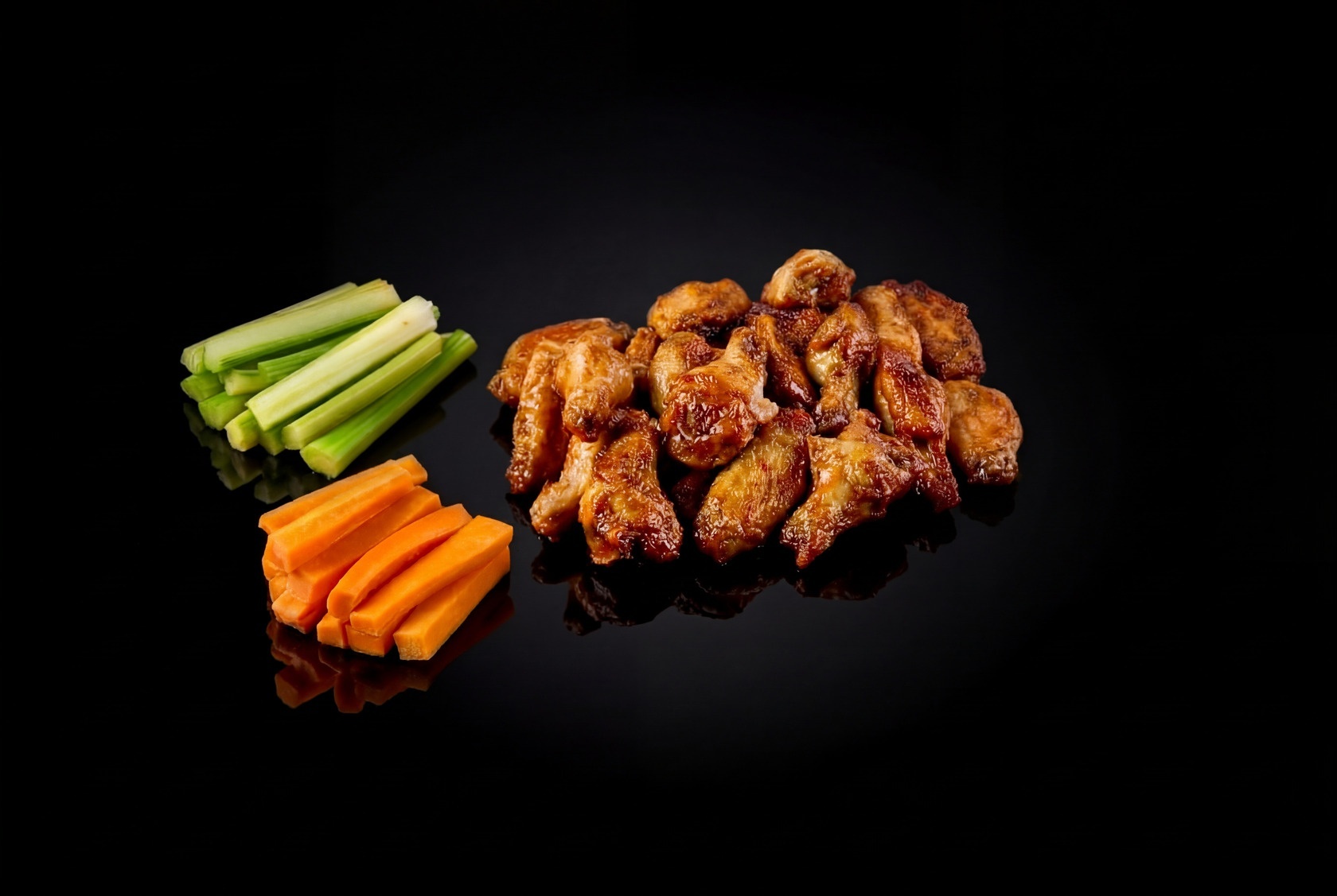 Хрустящая корочка с невероятно сочным и нежным мясом, готовят блюдо с добавлением ароматных специй. Более ярким его делает нарезка из свежей сладкой моркови и стеблей сельдерея. С крылышками барбекю отлично гармонирует нежный соус, он подходит не только к птице, но и к овощам.