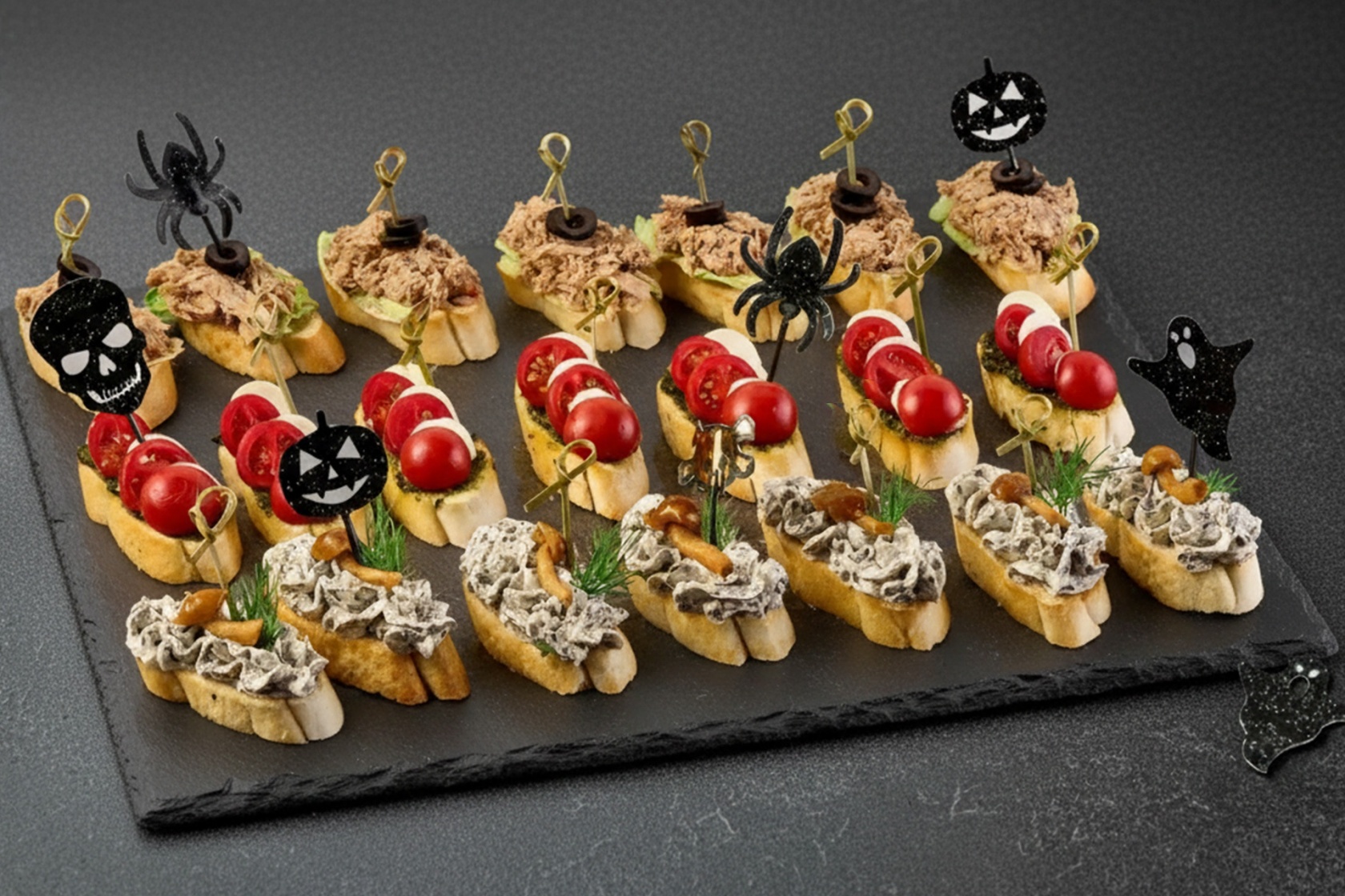 Микс из брускетт оформлен тематическими шпажками на Halloween. Сытное угощение на вашу вечеринку.