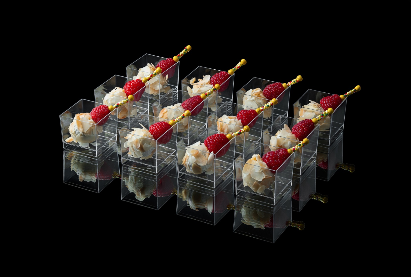 Миндально-сливочное буше с дор-блю и свежей малиной - премиальная холодная закуска в индивидуальных мини-верринах, созданная на основе тонкого вкусового контраста. Творожный сливочный сыр, смешанный с дор-блю, формирует нежный, насыщенный и многослойный крем с деликатной сырной глубиной. Миндальные лепестки добавляют хруст и лёгкий ореховый акцент, а свежая малина привносит естественную ягодную яркость и чистую кисло-сладкую ноту. Прозрачная подача подчёркивает цвет и текстуру композиции, делая буше визуально лёгким и выразительным. Закуска гармонично смотрится в премиальных фуршетных сетах и отлично сочетается с блюдами на основе сыров, мясных деликатесов и ярких ягодных акцентов.