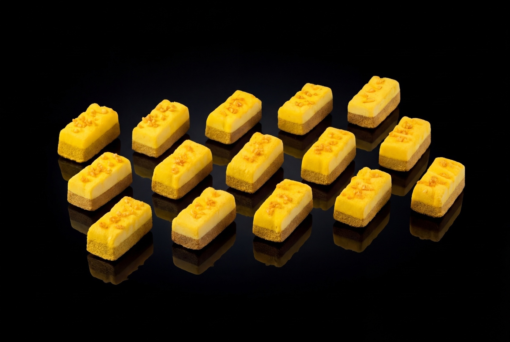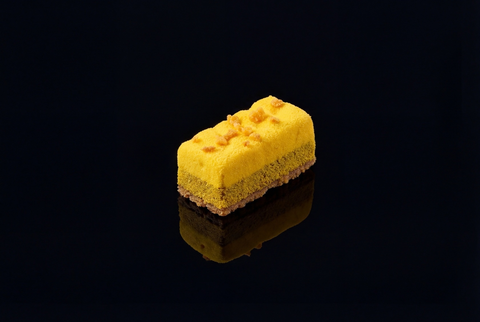 Двухслойное пирожное со вкусом темного шоколада и банана на пропитанном шоколадном бисквите.