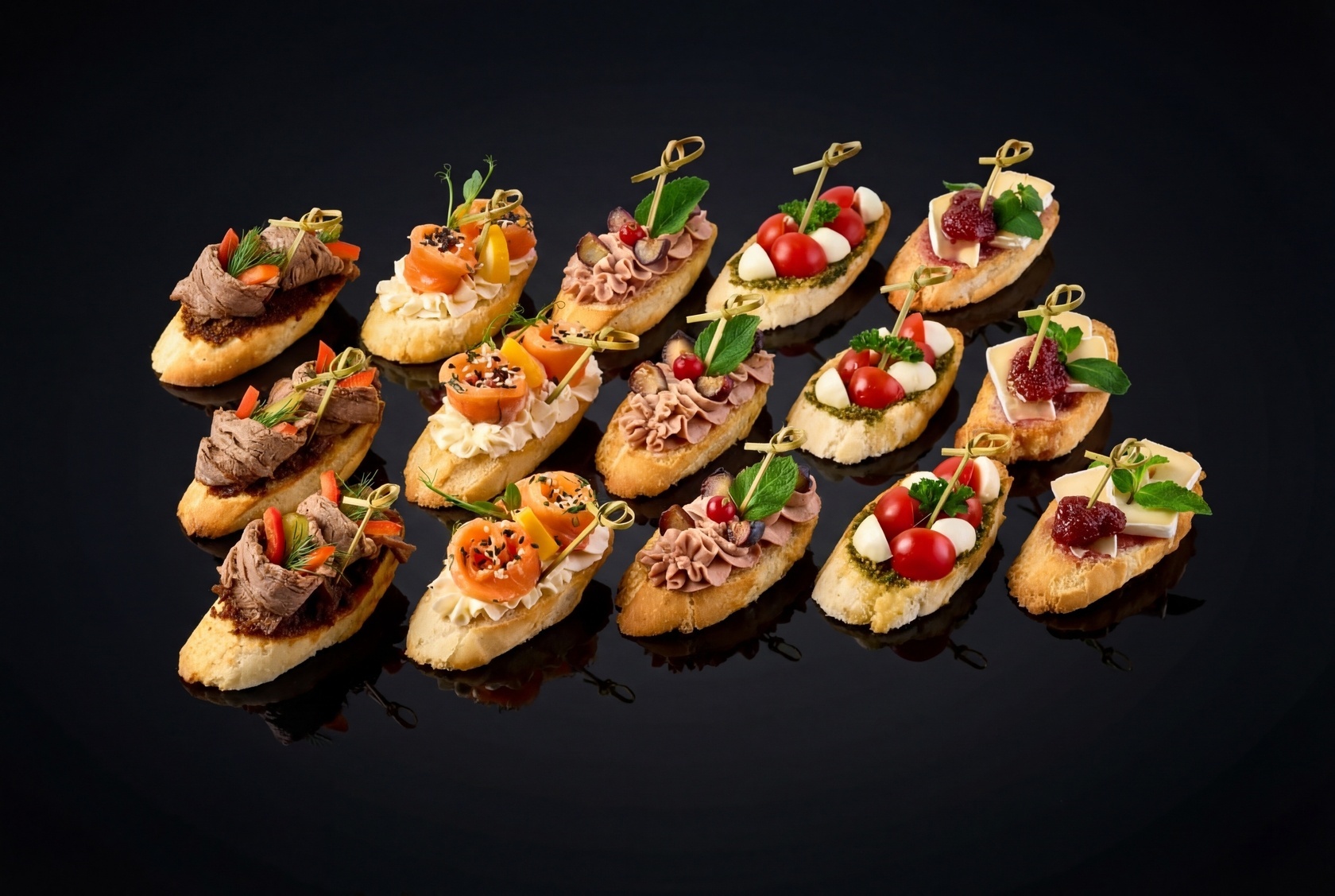 Брускетты с ростбифом порадуют вас нежной говяжьей вырезкой, вялеными томатами и хрустящими корнишонами, создавая гармоничный баланс между мясным и овощным вкусами. Для любителей сыра идеально подойдут брускетты с камамбером и клубничным вареньем, где сладость варенья прекрасно дополняет кремовый сыр. Брускетты с моцареллой, свежими помидорами черри и ароматным соусом песто, а также брускеттами с лососем и творожным сыром, украшенными ростками гороха и кунжутом. Завершает этот набор изысканная брускетта с гусиным паштетом, голубикой и красной смородиной, которая придаст вашему столу неповторимый шарм.