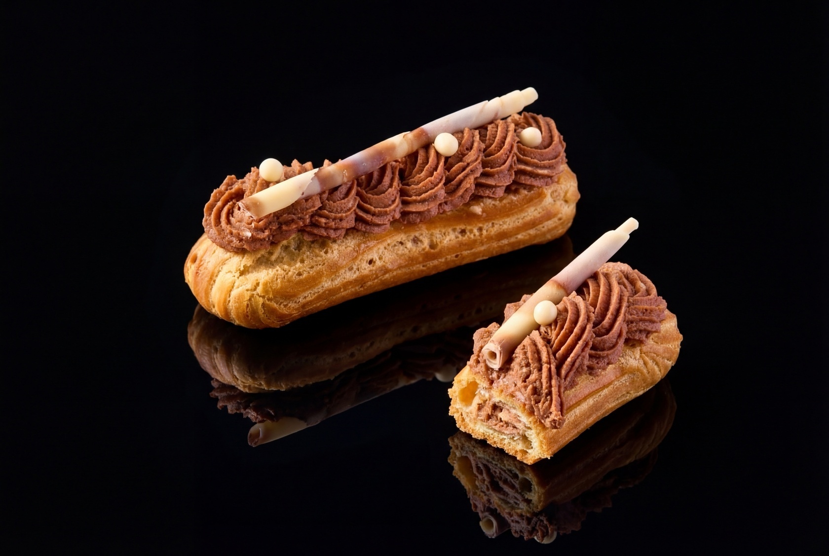 Эклеры состоят из хрустящей оболочки, выпеченной из слоеного теста, и нежного заварного крема, который может быть различных вкусов.