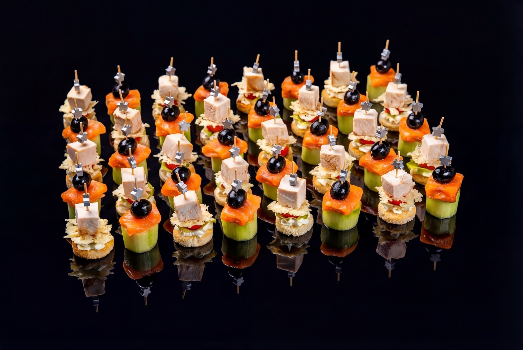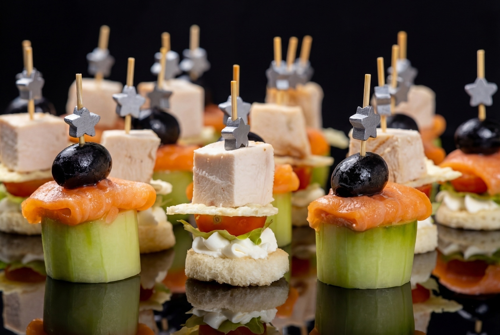 Канапе с огурцом и лососем — это легкое и освежающее дополнение к вашему столу. Свежий огурец в сочетании с нежным соленым лососем и маслинами придаст вашему мероприятию нотку морского вкуса.