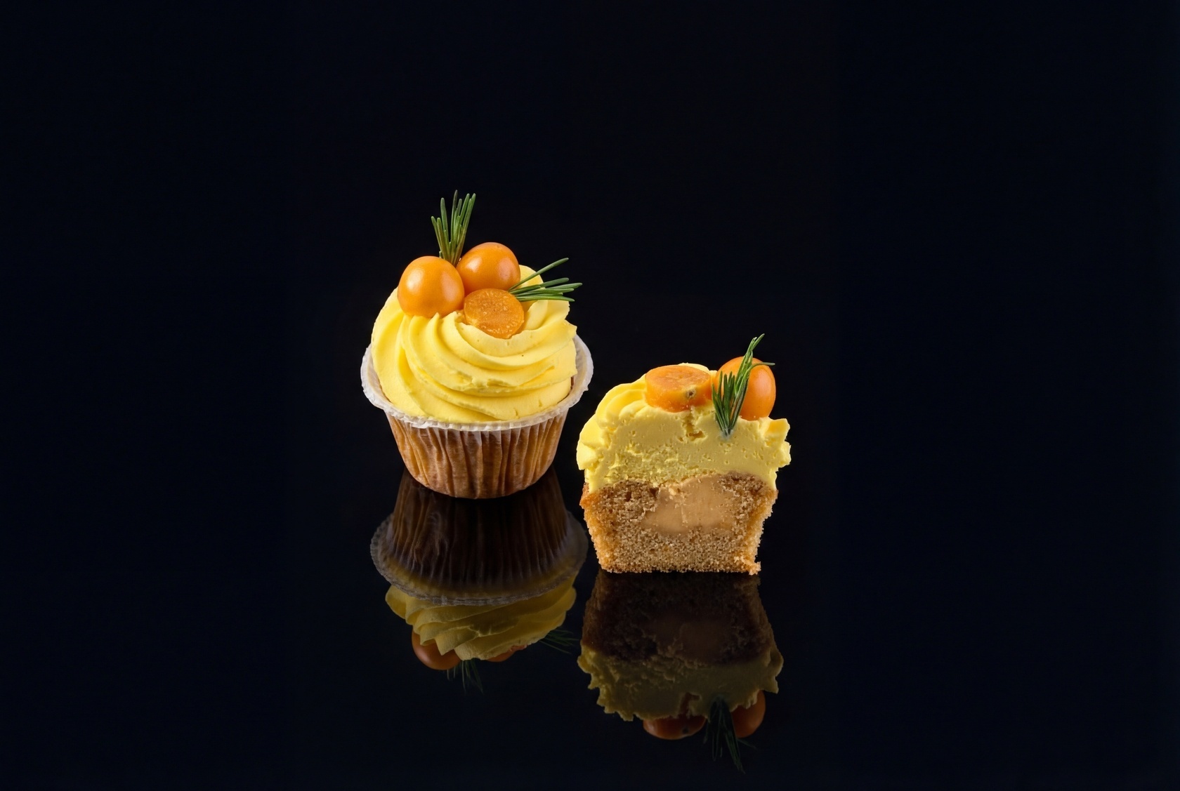 мука в/с, яйцо, сахар коричневый, разрыхлитель, цедра лимона, масло сливочное, соль, молоко, пудра сахарная, сыр креметте, краситель желтый пищевой, лимон, желатин, пюре маракуя, физалис, кумкват, розмарин.