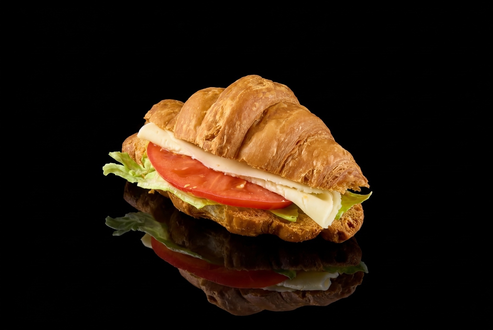 Набор круассанов с сыром моцарелла - это сочетание хрустящего слоеного теста, нежного сыра моцарелла, свежих помидоров и хрустящего салата айсберг с ароматным соусом песто. Он отлично подойдет для завтрака, перекуса или ужина, идеально дополняя ваше меню на любом празднике.
