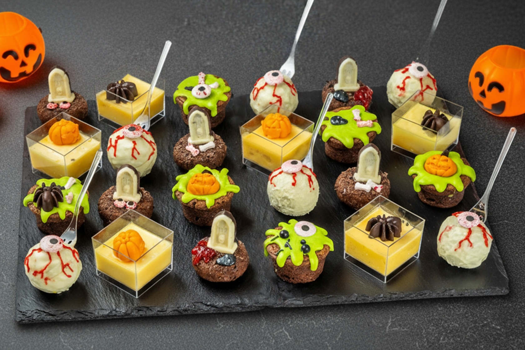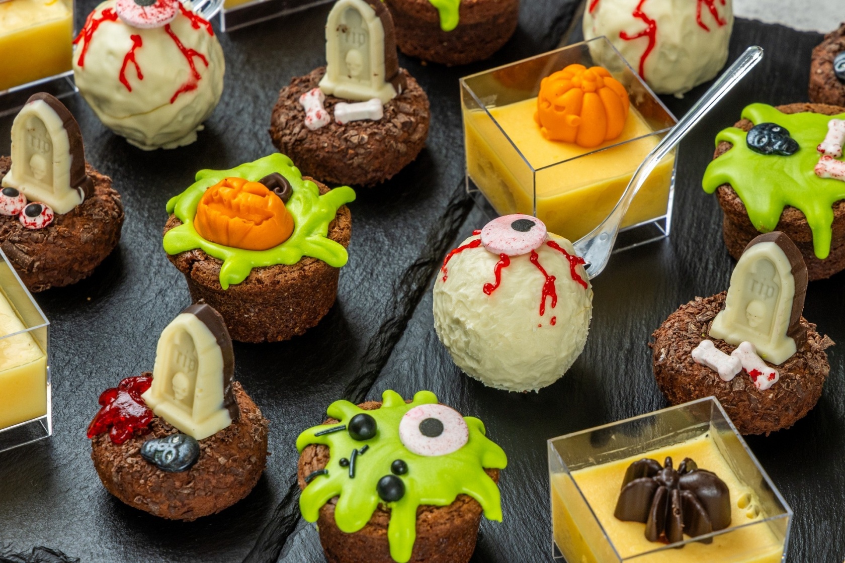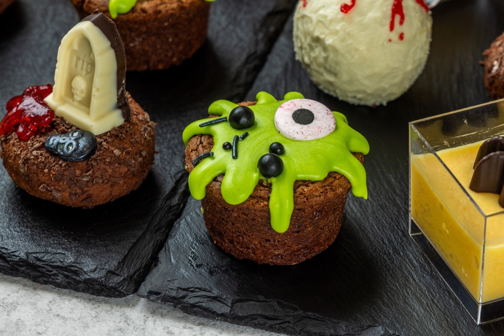 Изысканное ассорти хэллоуинских мини-десертов: нежная тыква, апельсин, клюква и шоколад соединяются в идеальный дуэт осени и волшебства. Сет, в котором жуть и сладость живут в гармонии — для тех, кто выбирает вкус с характером.
