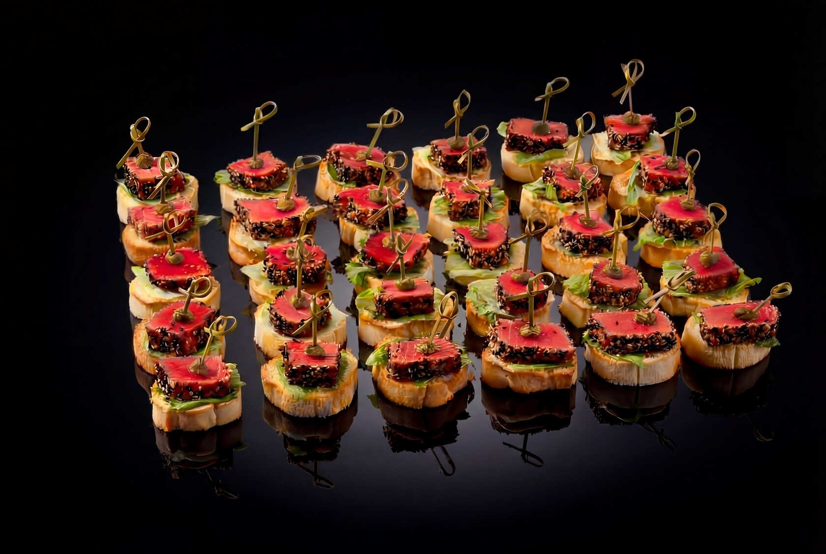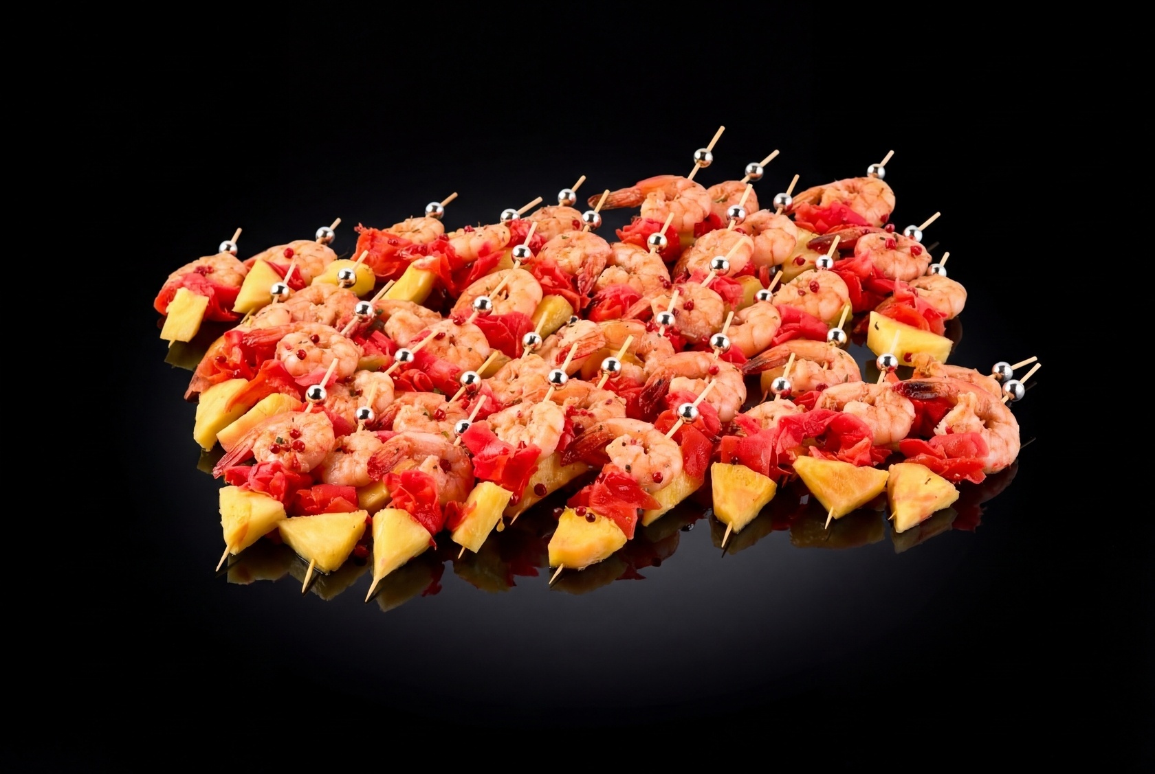 Фуршетный сет «Светская жизнь» — в наборе тигровые креветки с ананасом, которые порадуют вас нежным сочетанием морепродуктов и тропических нот, канапе с тунцом и тарталетки с красной рыбой и авокадо добавят изюминку, и тарталетки с уткой и индейкой подарят насыщенный вкус, который не оставит равнодушным никого из гостей.
