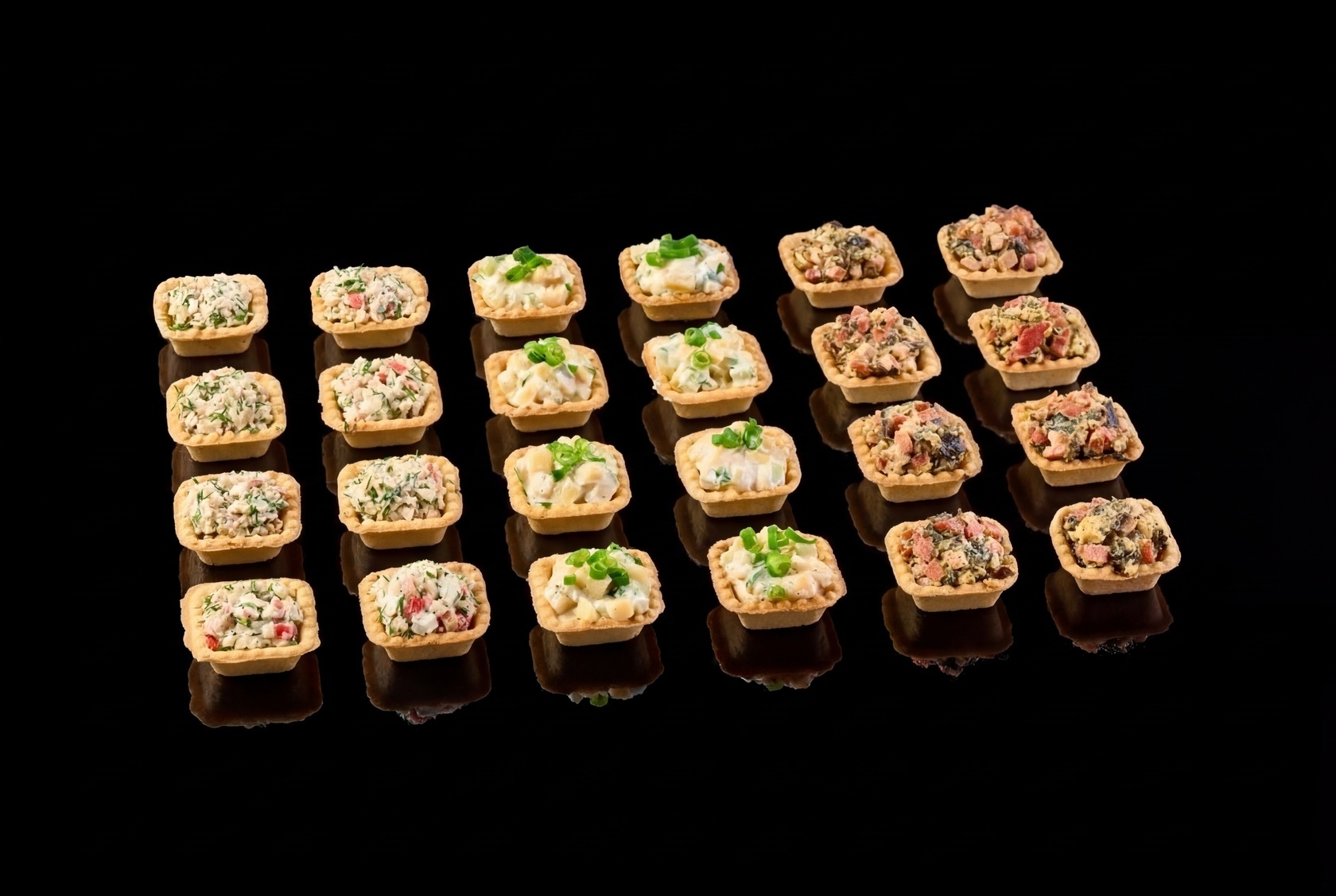 Набор тарталеток «Вдохновение» — это отличное решение для любого формата мероприятия. Внутри каждой тарталетки вас ждет разнообразие начинок, которые порадуют даже самых требовательных любителей закусок. Салаты, наполненные нежными грибами, куриным филе, колбасами и свежими овощами, создают гармоничное сочетание вкусов и текстур. Добавление отварных кальмаров и крабовых палочек придаёт тарталеткам морской акцент, а свежая зелень и пряные специи делают каждую порцию по-настоящему аппетитной.