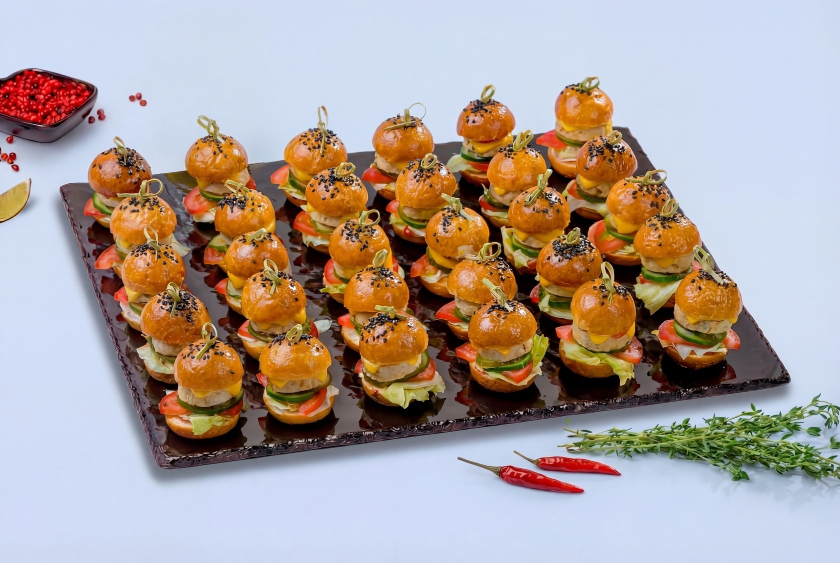 Нано бургеры с курицей — это идеальный выбор для фуршетов и коктейльных вечеринок! Эти мини-бургеры сочетают в себе нежное филе курицы, свежие овощи и ароматный сыр чеддер, создавая незабываемый вкус в компактном формате.