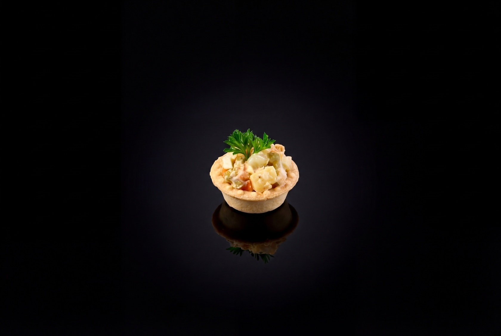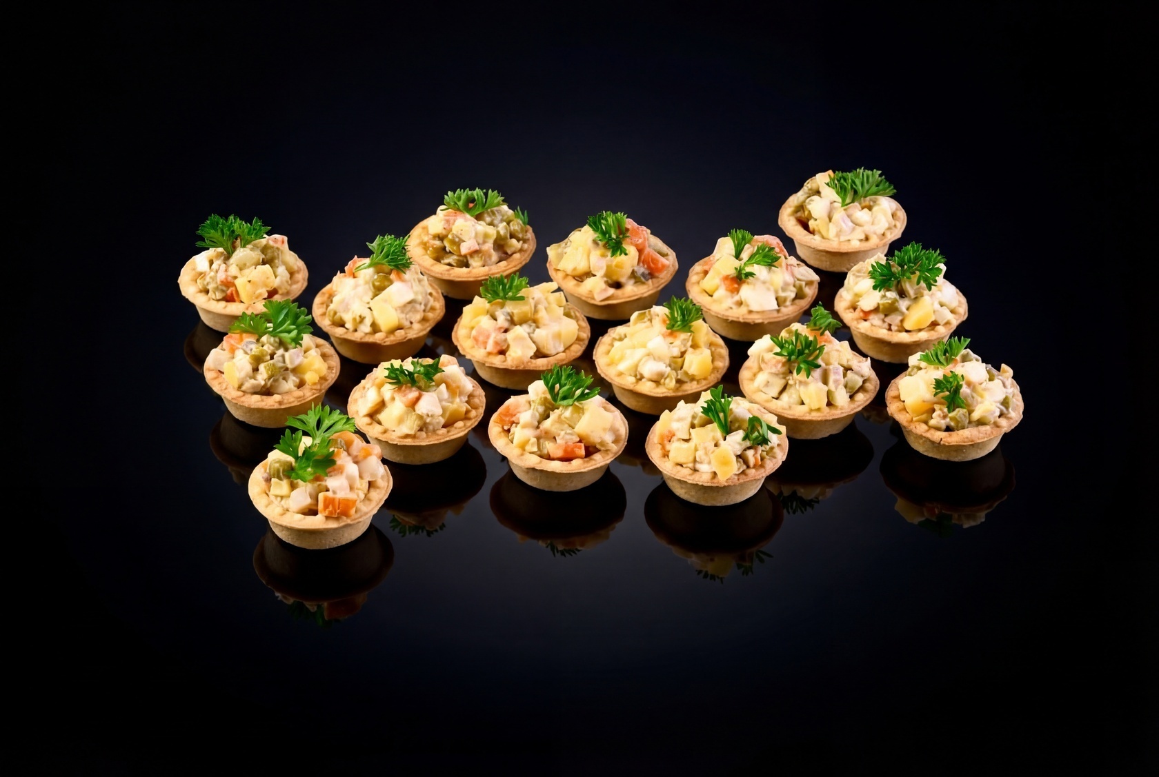Тарталетки с салатом оливье — это классическая закуска, которая станет отличным дополнением к любому столу. Каждая тарталетка выполнена из нежного песочного теста и наполнена аппетитной начинкой, в которой гармонично сочетаются картофель, морковь, куриное филе, яйца и соленые огурцы.