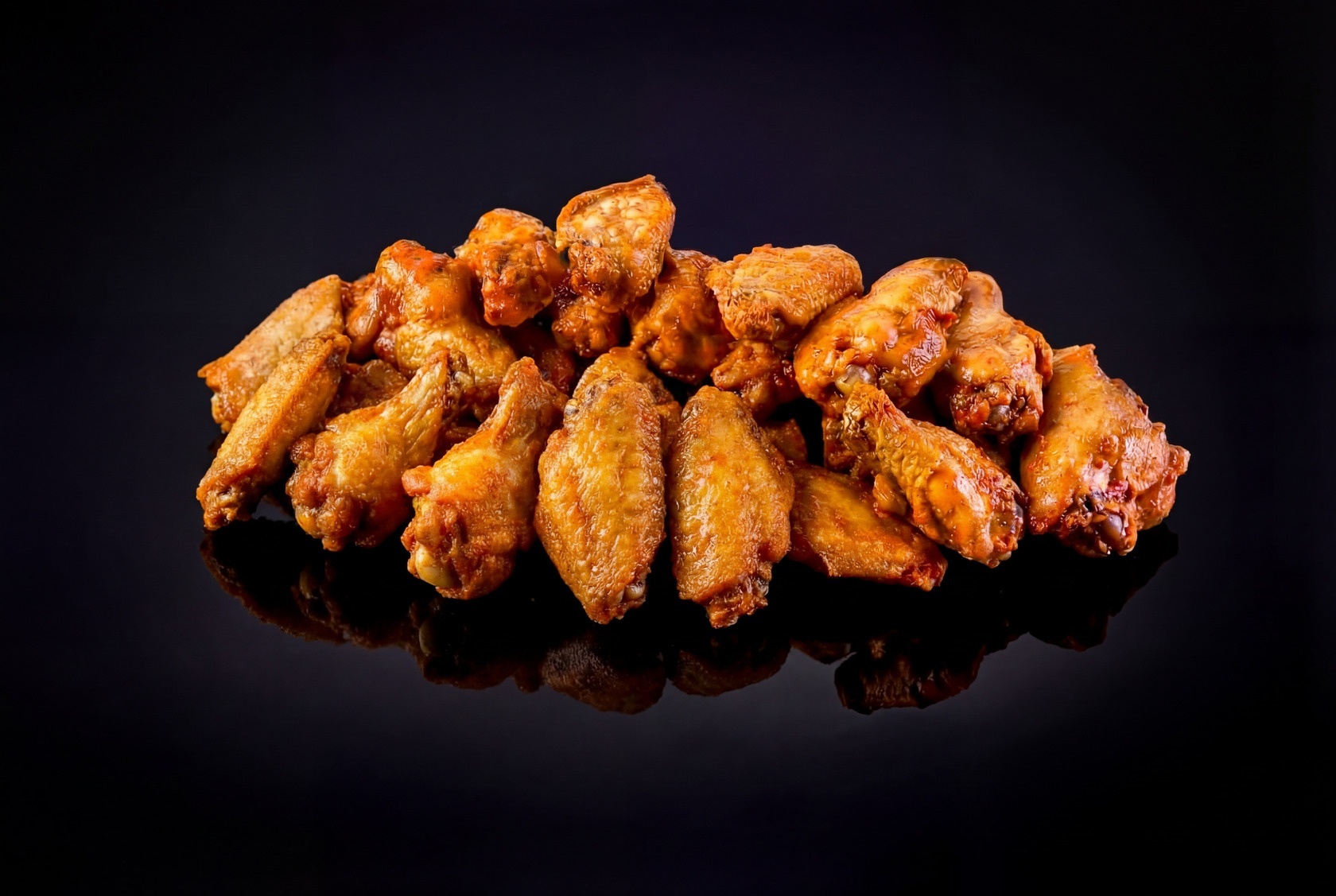 Острые куриные крылышки в хрустящей панировке, подаются с овощными палочками и соусами Барбекю и блючиз.
