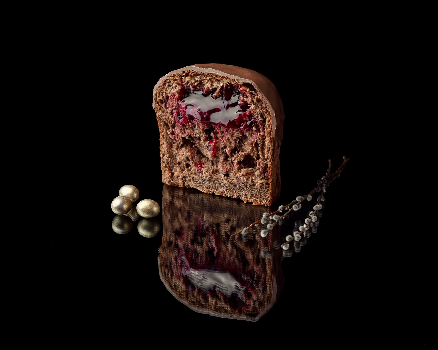 Кулич украшен шоколадной глазурью и изысканным пасхальным декором: шоколадным гнездом, декоративными яйцами и элементами сусального золота. Элегантное оформление придаёт десерту торжественный вид и делает его эффектным украшением пасхального стола. Пасхальный шоколадный кулич с вишней - современное прочтение традиционной пасхальной выпечки. Ароматный, мягкий и насыщенный, он станет ярким десертом для праздничного чаепития и стильным подарком к светлому празднику Пасхи.