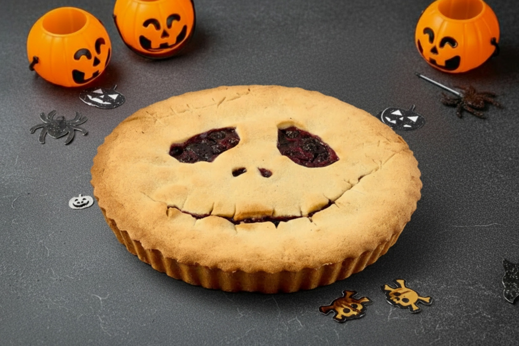 Песочный пирог с начинкой из натуральной черники. Вкусное оформление вечеринки Halloween.
