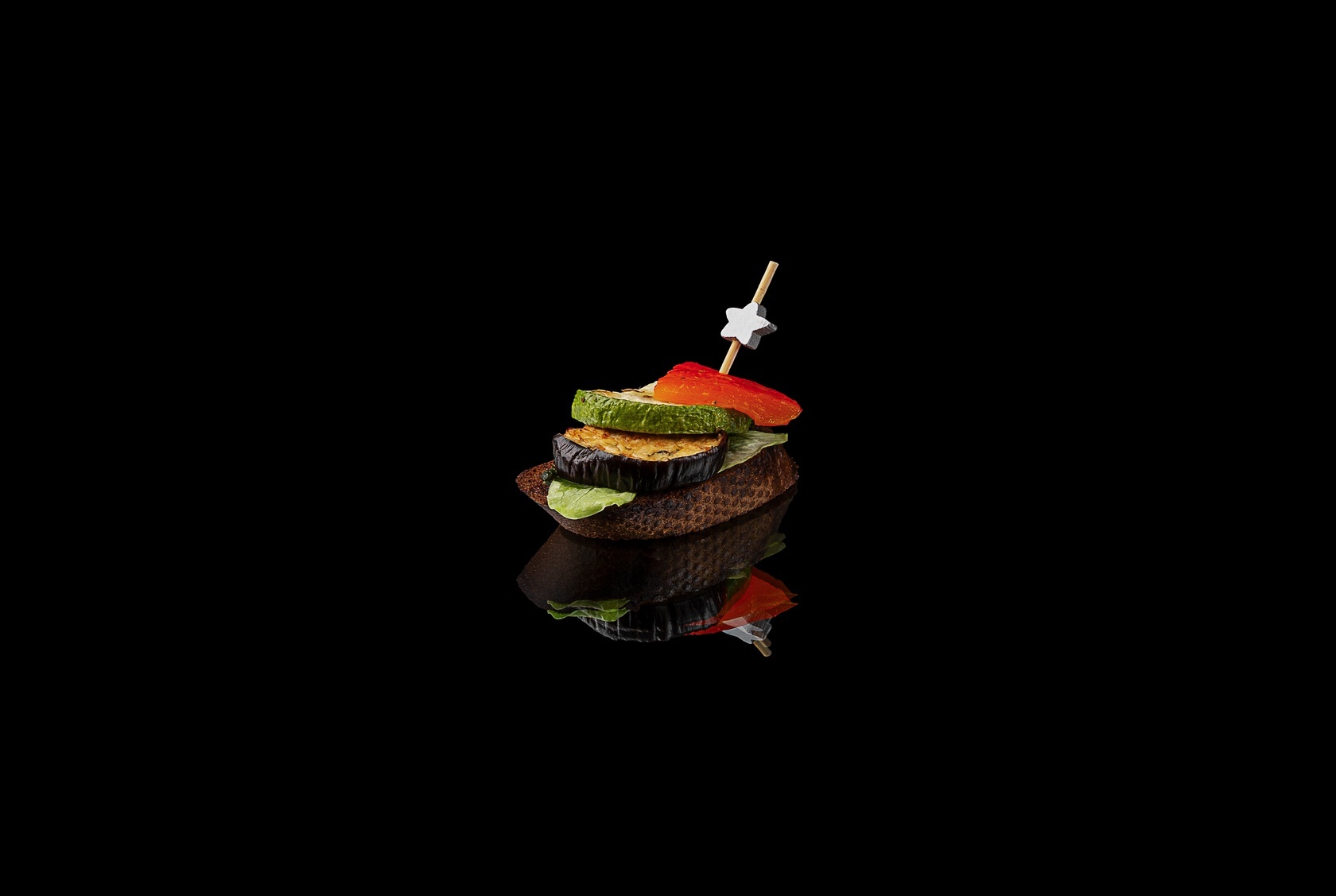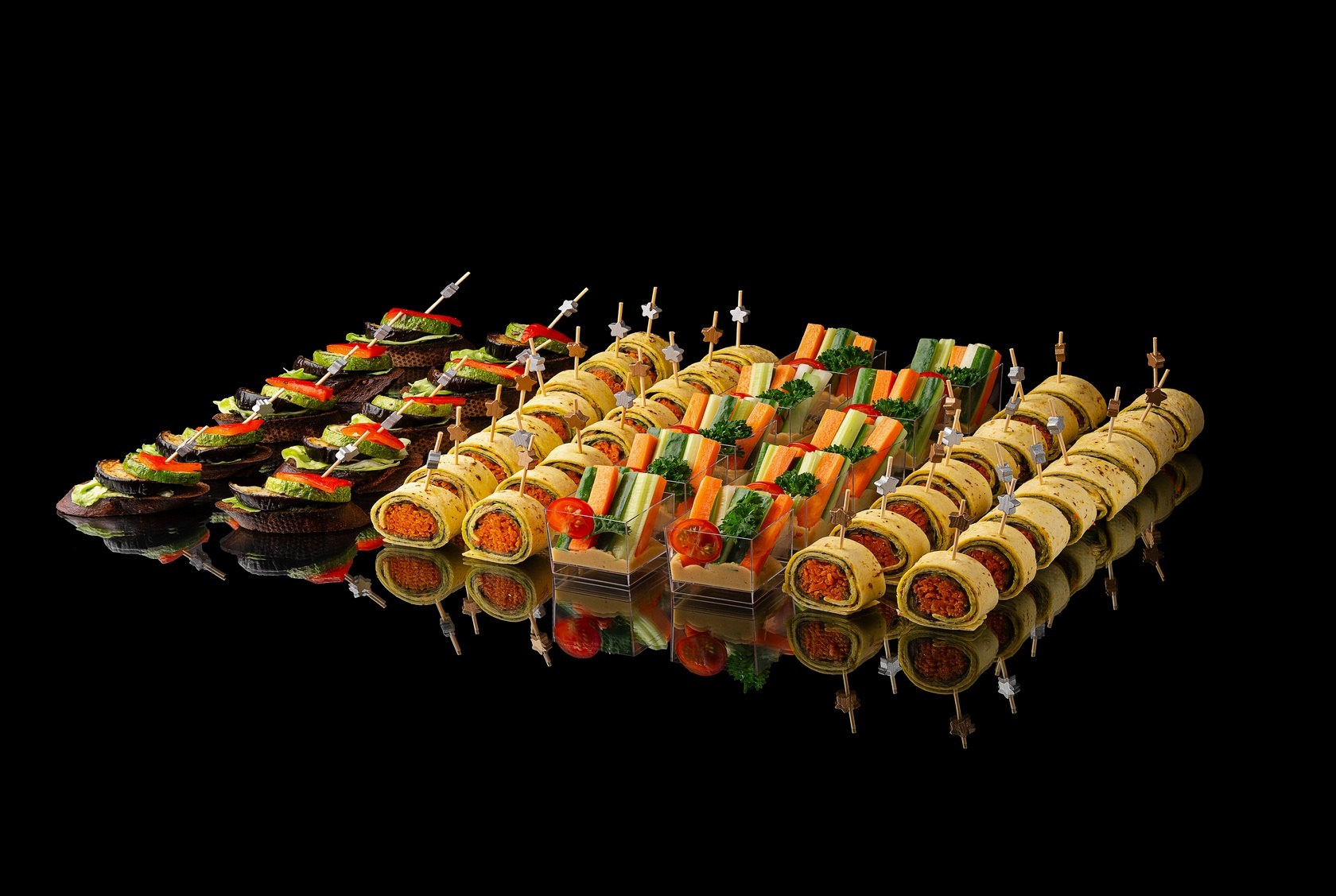 Брускетты с запечёнными баклажанами, кабачками и перцем раскрываются тёплым, насыщенным вкусом, дополненным ароматным соусом песто и ржаным багетом. Рулетики из пшеничной тортильи с овощами и песто добавляют мягкость и выразительность, подчёркнутую лёгкой пикантностью моркови по-корейски. Веррины с овощными палочками и хумусом завершают композицию свежим, чистым акцентом, создавая баланс и визуальную лёгкость.