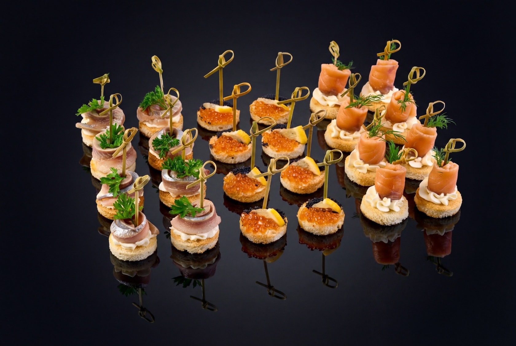В качестве базы для закусок в наборе используется пшеничный тост. В канапе «С икрой» сочетается красная икра и Тобико, дополненные сливочным маслом и ломтиком лимона. Закуска «С сельдью» приготовлена из ломтиков слабосоленой сельди со сливочным сыром и свежей зеленью. В канапе «С семгой» гармонию нашли ломтики слабосоленой семги и сливочный сыр.
