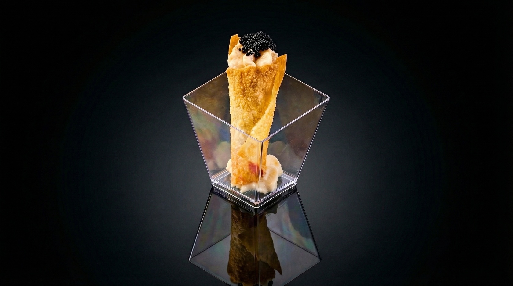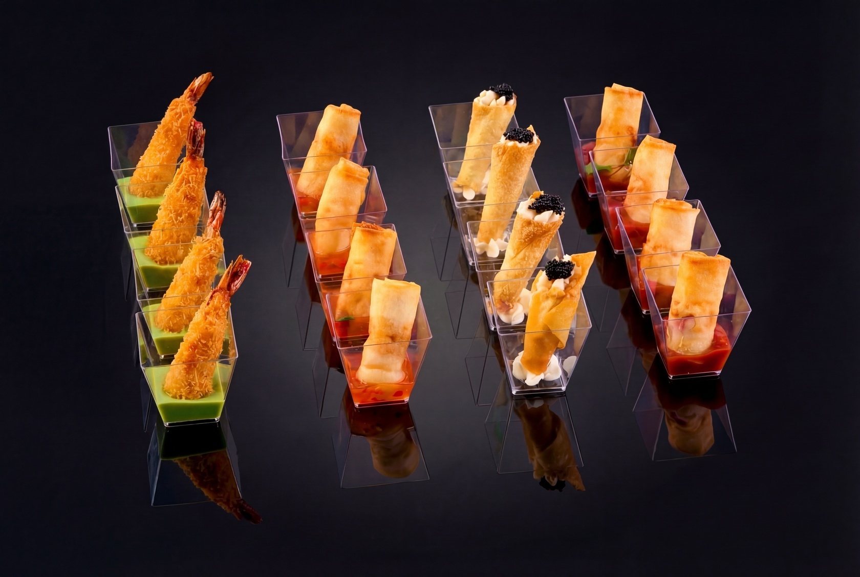 Особенность этого сета закусок – сочетание необычных ингредиентов, характерное для кухни в стиле фьюжн, но с акцентом на восточные кулинарные традиции. В набор входят креветки, приготовленные в рисовой лапше фунчозе со сладким соусом вассаби, кунжутные конусы, наполненные муссом из копченого лосося и черной японской икрой тобико, овощные спринг роллы со сладким соусом чили, китайские вонтоны с крем-сыром, перчиком халапеньо и соусом на основе сметаны. Все подается в верринах.