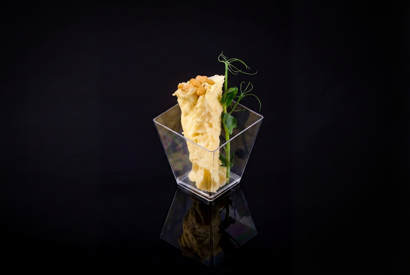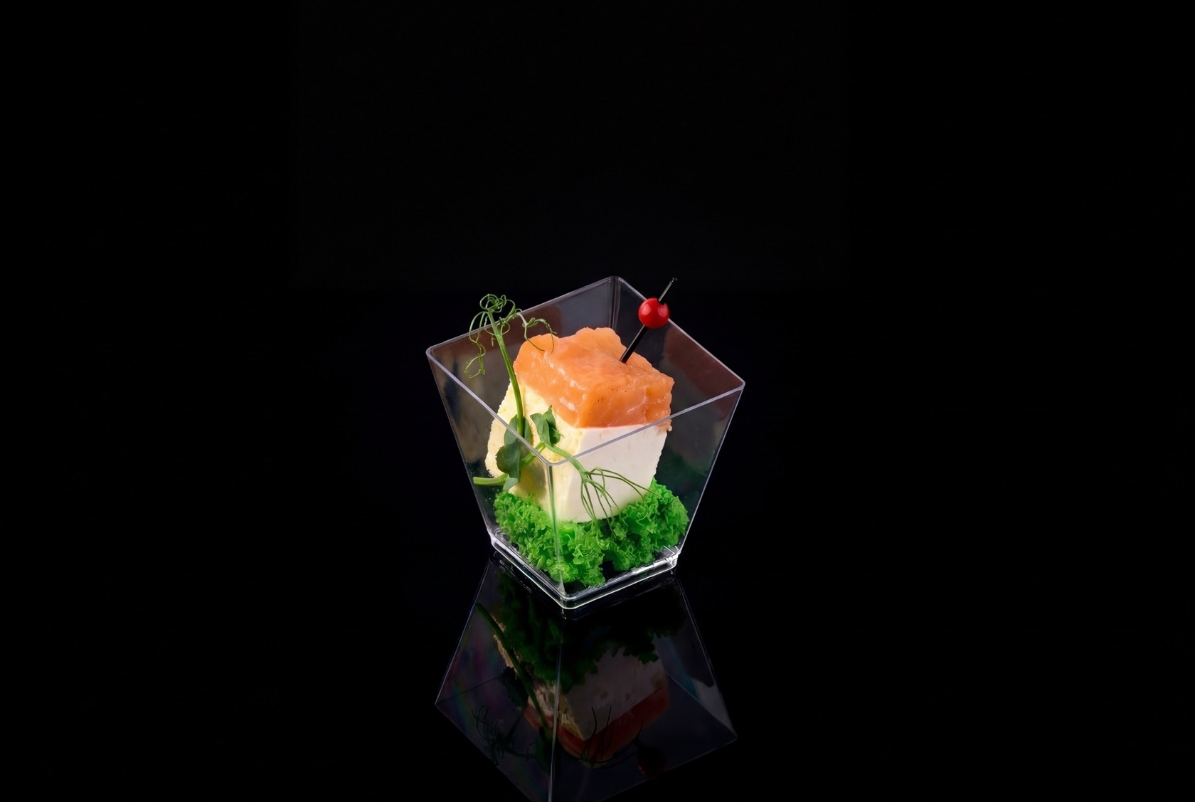 Этот роскошный сет с закусками – настоящее украшение новогоднего стола. По цвету и дизайну он и в самом деле напоминает оформление рождественской елки. В набор входят необычные закуски. Чипсы из очень твердого сыра пармезан с начинкой из крем-сыра, кедровых орешков и трюфельного масла – уже звучит соблазнительно. Но в набор также входят роллы из цукини, наполненные сырным муссом, кедровыми орешками и зеленью, а также террин (запеченный паштет из копченого лосося) с картофельным муссом. Любителям необычных сочетаний понравится и полента из кукурузы с трюфельным маслом, черной икрой тобико и копченым палтусом.