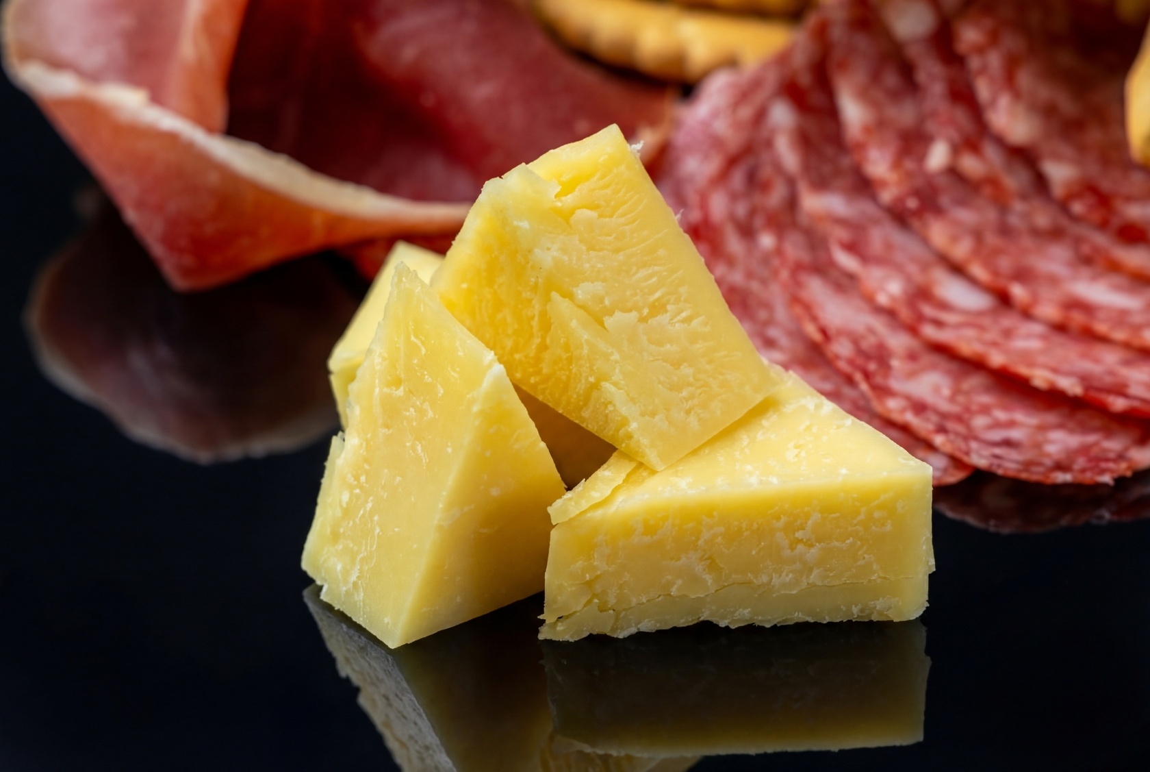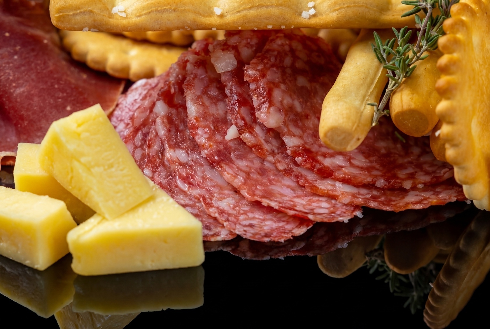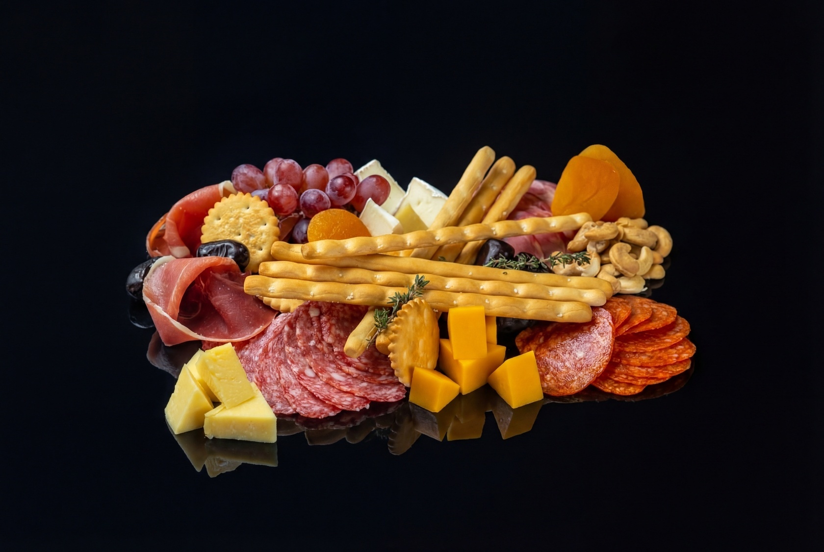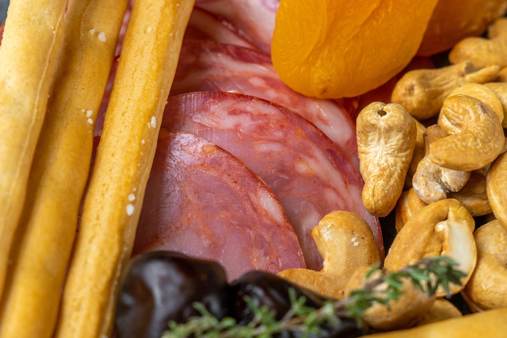 Насладитесь «Шаркутери борд» с мясной гастрономией, с премиум сырами, орехами, сухофруктами и крекером. В нашем наборе вы найдете аппетитные колбасы чоризо, пеперони и салями, а также нежную пармскую ветчину. Мясные деликатесы идеально дополняют разнообразие сыров: кремовый камамбер, насыщенный пармезан и острый чеддер.
