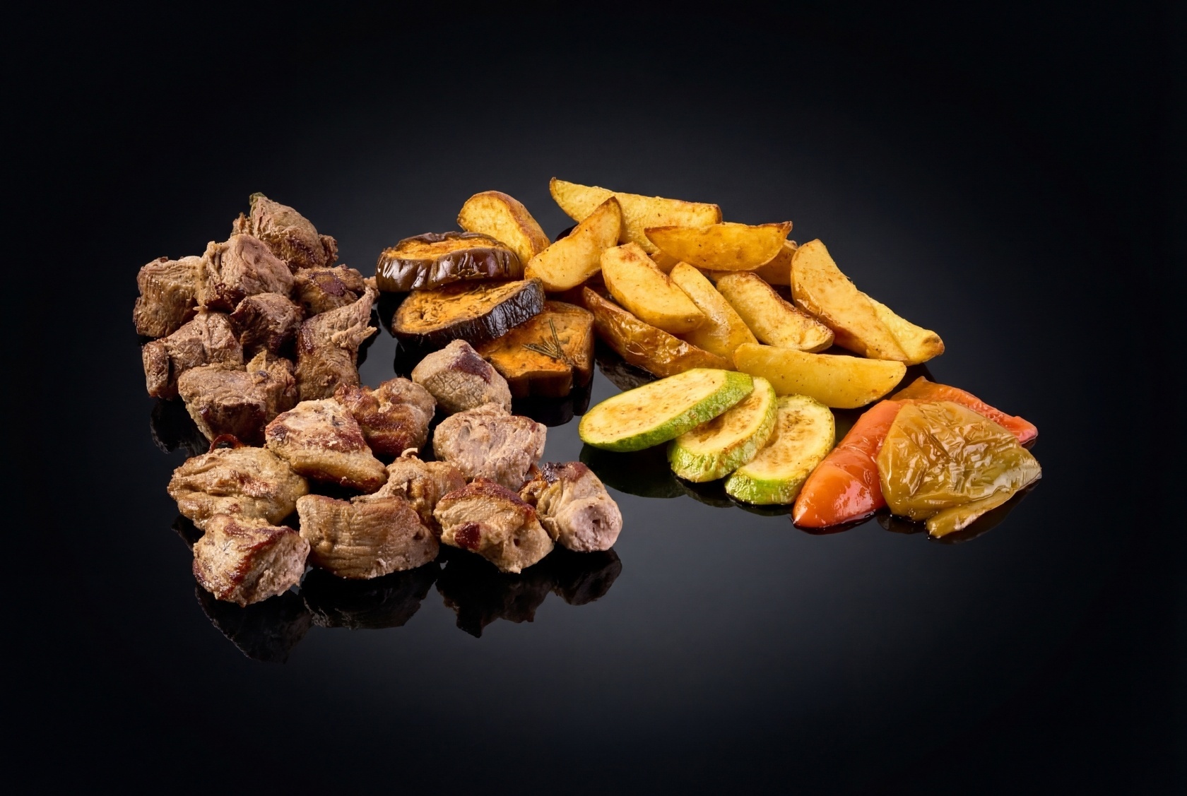 Готовят шашлык из сочной говяжьей вырезки и свиной шейки, которые приправляют классическими специями. Мясо сочное, с аппетитной румяной корочкой и невероятно ароматное. Овощная составляющая набора включает приготовленные на мангале ломтики картофеля, кабачка, томата и болгарского перца. Тающее во рту мясо, ароматные овощи и два вида соуса – кетчуп и Сальса – все для гармонии вкуса.