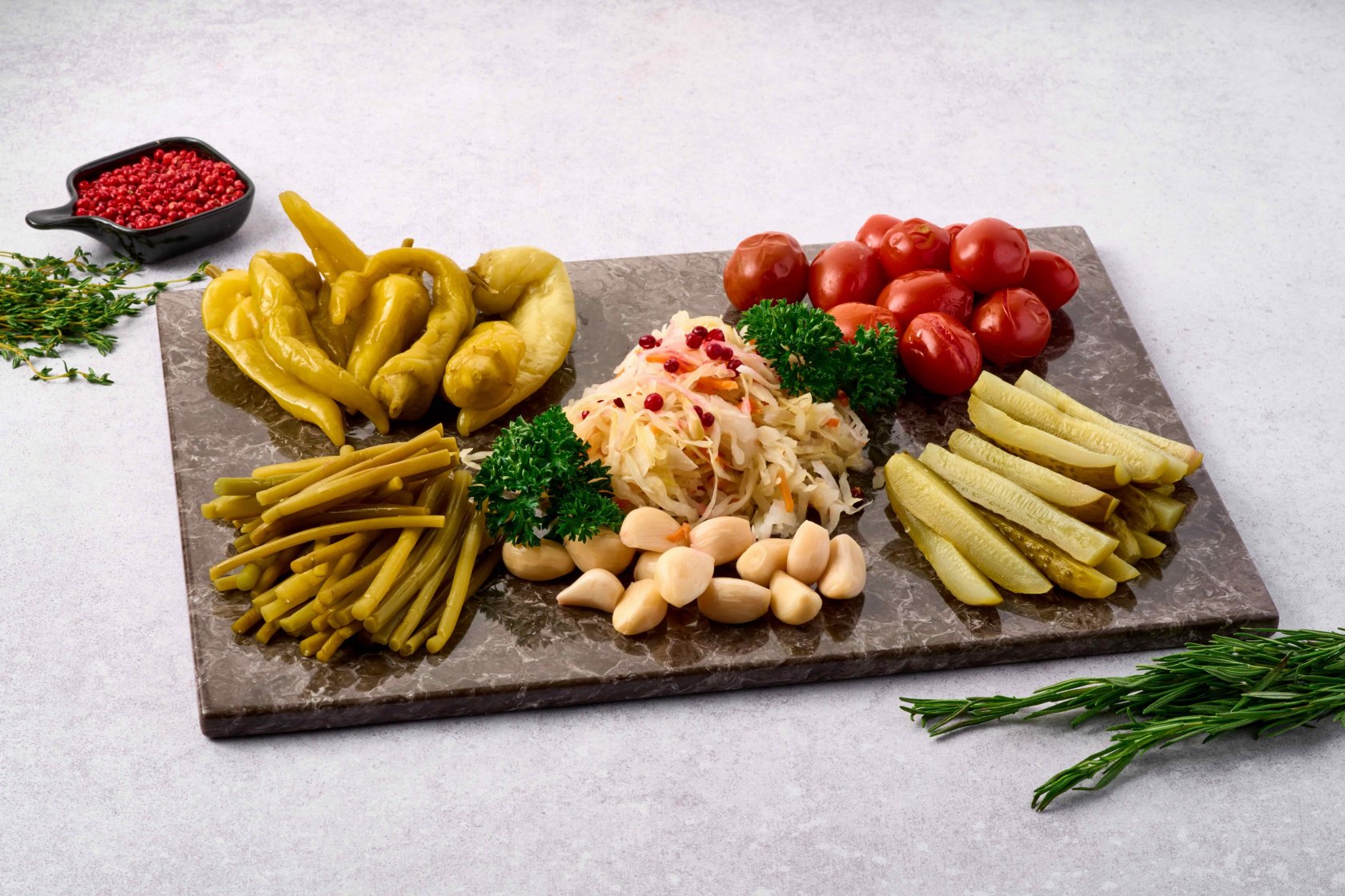 Прекрасные закуски, возбуждающие аппетит: соленые огурчики, соленые зеленые перчики, соленые помидорчики Черри, маринованный чесночок, квашеная капустка, маринованная черемша.