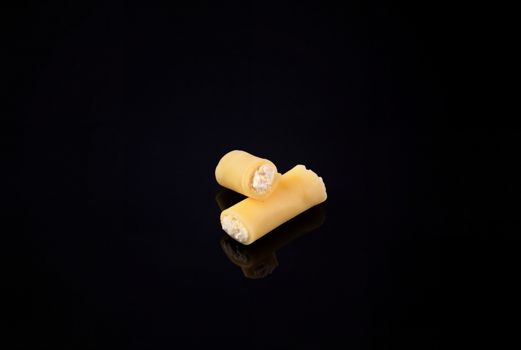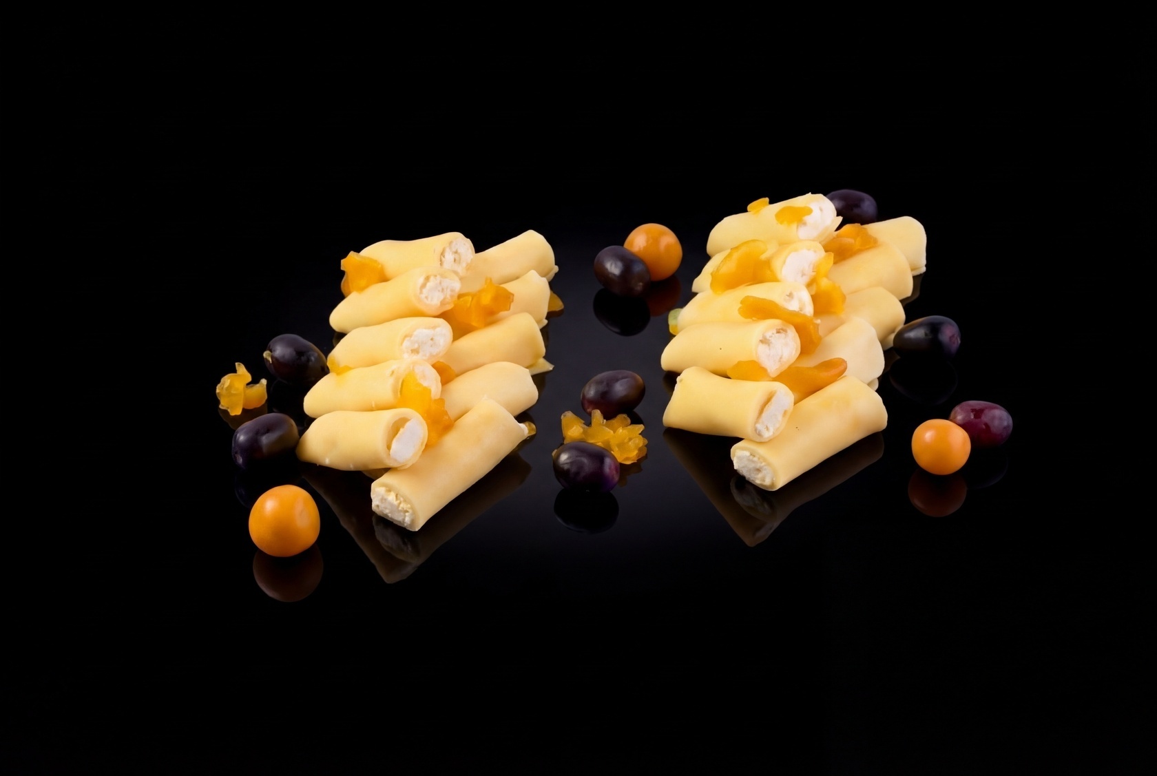 Основой для сырных рулетиков выступает ломтик сыра Гауда с его утонченным классическим вкусом. Начинку готовят из свежего творога, кусочков кураги и свежих ягод винограда. У начинки получается восхитительный творожный вкус с нотками ягодной свежести. Благодаря ягодам винограда и ломтикам янтарной кураги сервировка закуски получается исключительной. Подается с медом.