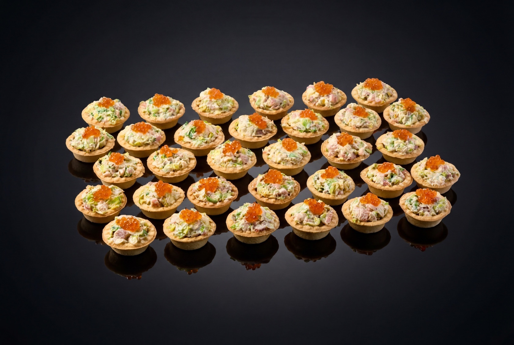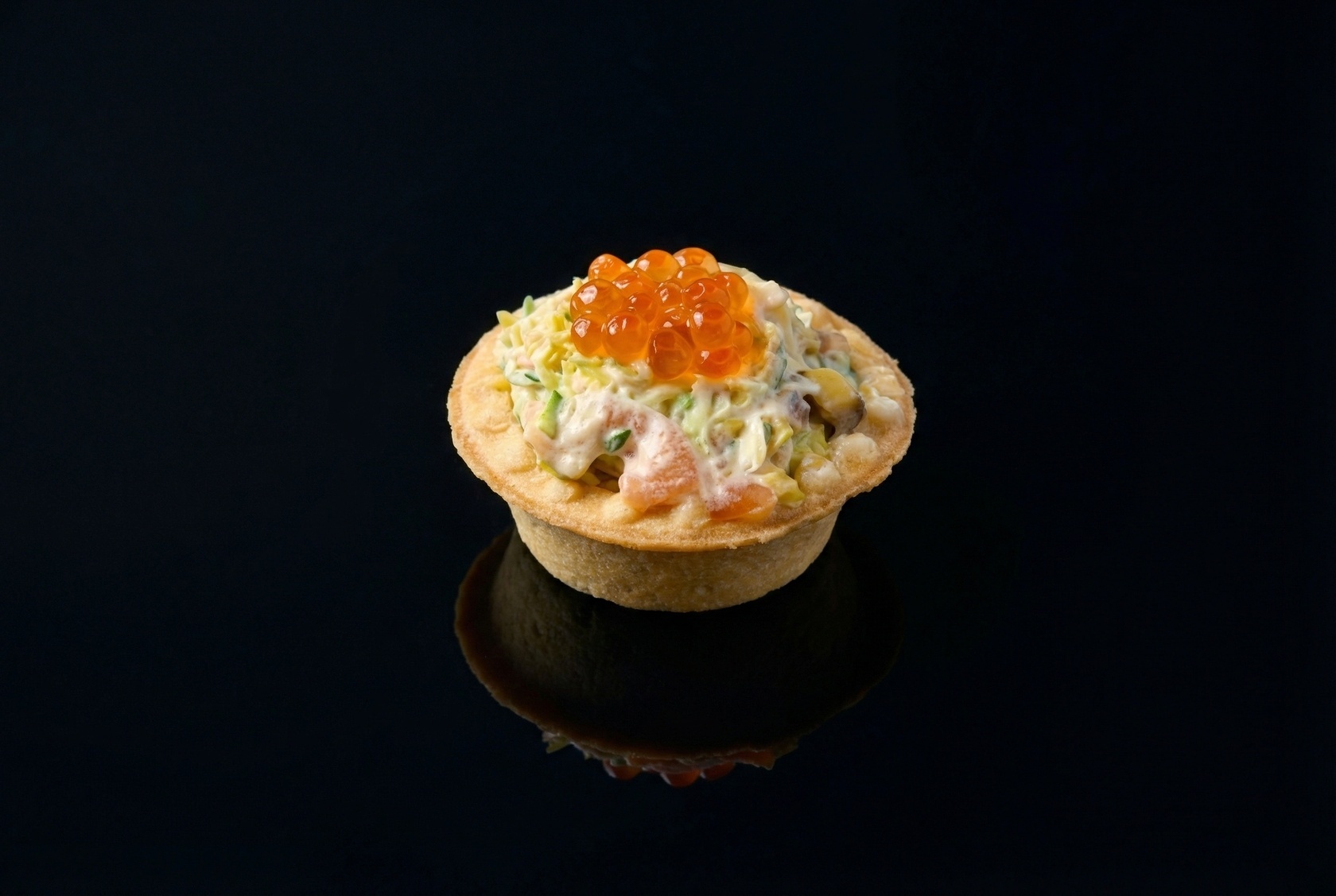 Основу закуски составляют хрустящие тарталетки из песочного теста. Начинку для них готовят из слабосоленого форели, авокадо, хрустящих салатных листьев и сливочного сыра. Неповторимым дополнением сервировки и вкуса выступает красная икра. Рыбные компоненты отлично смягчает нейтральный вкус авокадо и сыра, закуска понравится даже тем, кто не считает себя большим поклонником красной рыбы.