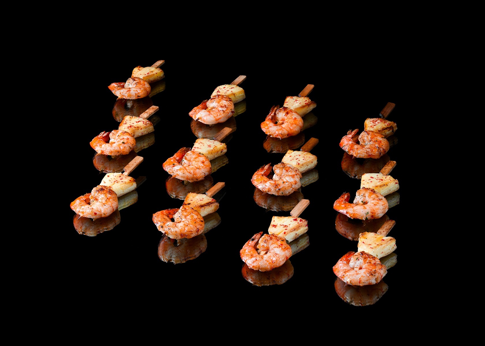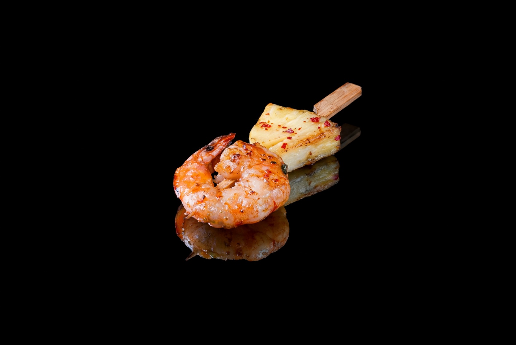 Креветки тигровые, масло растительное, соль, кинза свежая, перец красный острый молотый, чеснок очищенный, ананас свежий, розмарин свежий, перец розовый (горошек).