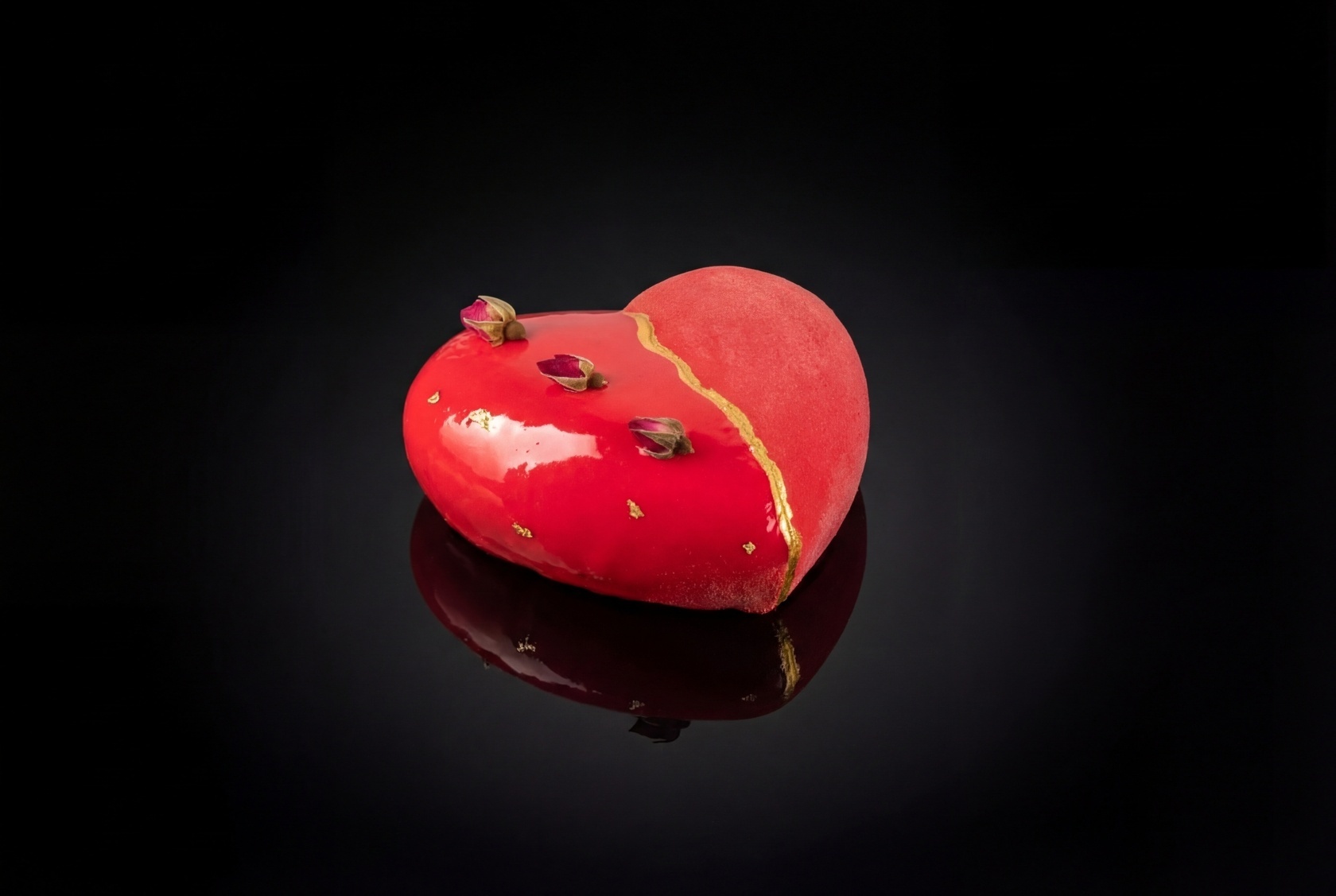 Это – очень необычный торт, которым можно порадовать свою вторую половину и в День святого Валентина, и в любой другой день (например, в годовщину свадьбы). Шоколадный бисквит и хрустящее печенье сабле отлично сочетаются с фруктовым муссом и нежным клубничным кремом. Половина торта, изготовленного в виде сердечка, покрыта красным глассажем (зеркальной глазурью), половина – кондитерским велюром с его бархатистой текстурой. Такой дизайн выглядит необычно, но внешний эффект – не главное, этот легкий и нежный торт буквально тает во рту.