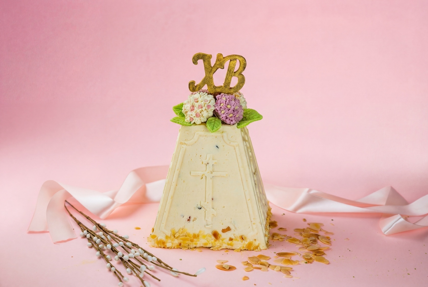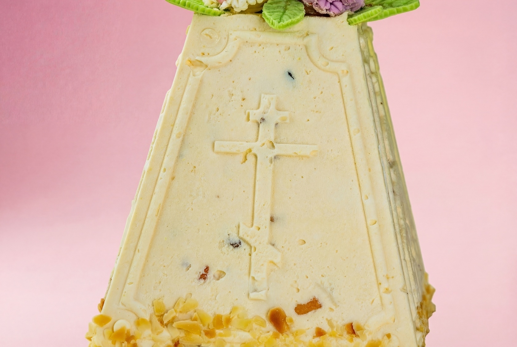 Творожная пасха - популярное пасхальное блюдо. Она представляет собой нежную творожную массу, смешанную с цукатами. Творожная пасха с цукатами украшена миндальными лепестками и тематическими украшениями.