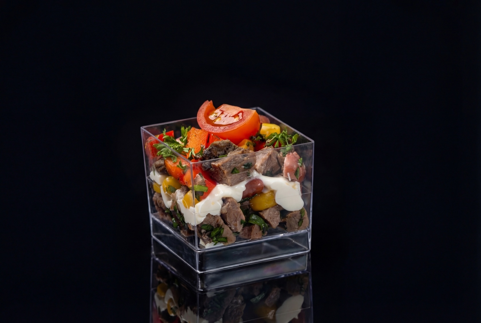 Веррины с салатом «говядина с кукурузой и фасолью» станут настоящим открытием для любителей сытных закусок. Вырезка говяжья в сочетании со сладкой кукурузой и нежной фасолью создает насыщенный вкус, а добавление черри и зеленого лука придает свежесть и яркость.