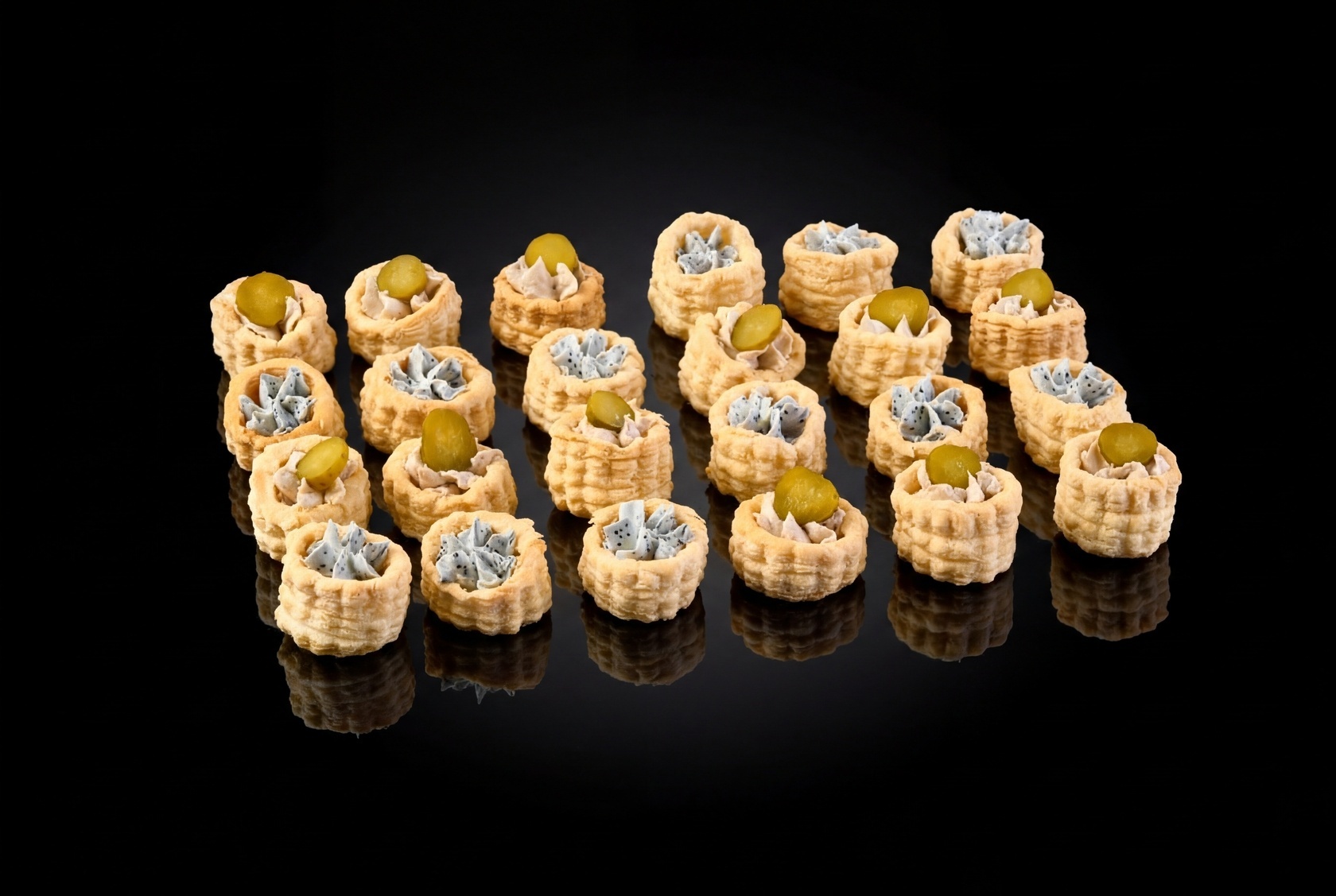 Волованы «Рыбный дуэт» — это аппетитная закуска, которая станет настоящим хитом на вашем мероприятии. Каждый волован из слоеного теста наполнен нежным кремом чиз, который прекрасно дополняет насыщенный вкус сельди с легкой соленостью. Маринованные огурцы добавляют свежести, а черная икра летучей рыбы завершает композицию, придавая каждому укусу особую изюминку.