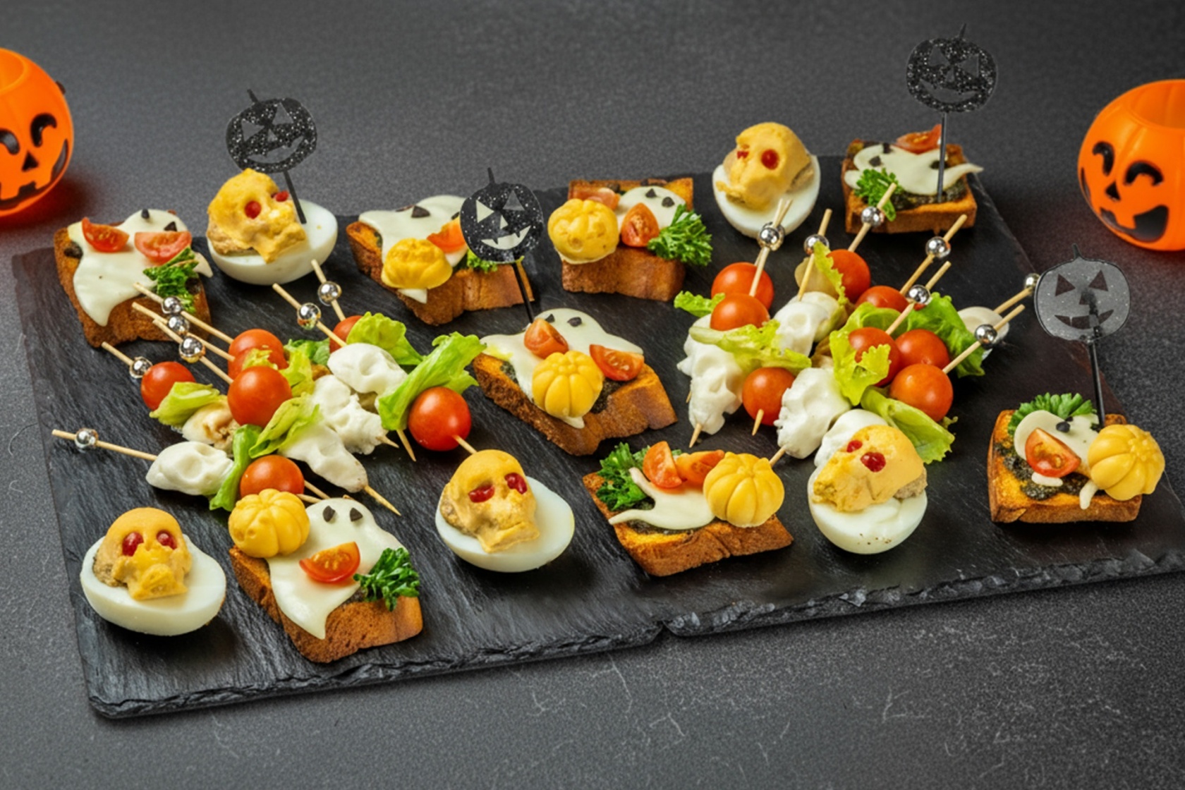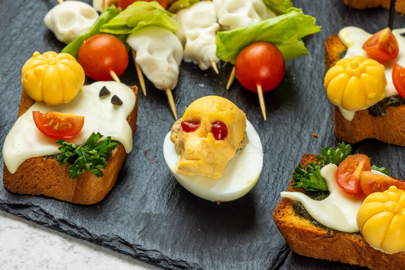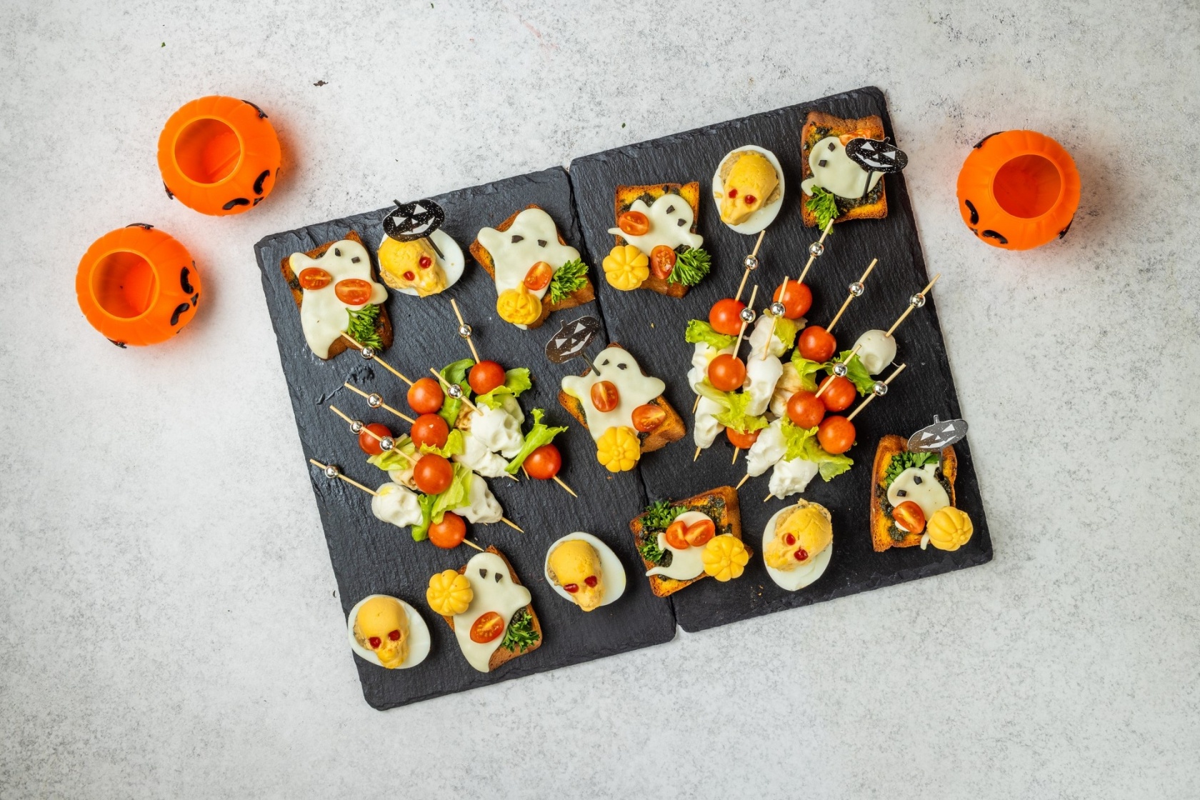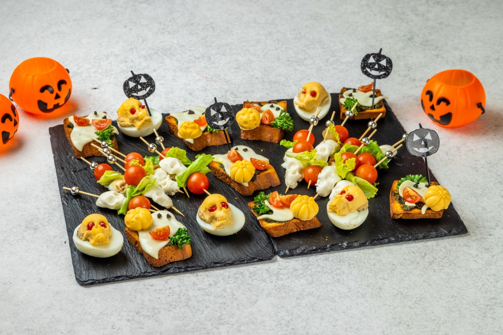 Яркий сет холодных закусок для самой вкусной вечеринки октября! Бриошь с соусом песто и плавленным сыром Чеддер, мини-шпажки с Моцареллой и черри, фаршированные яйца с муссом из шпрот. Весёлое оформление, насыщенные вкусы и капелька мистики — идеально для праздничного фуршета в стиле Хэллоуин.